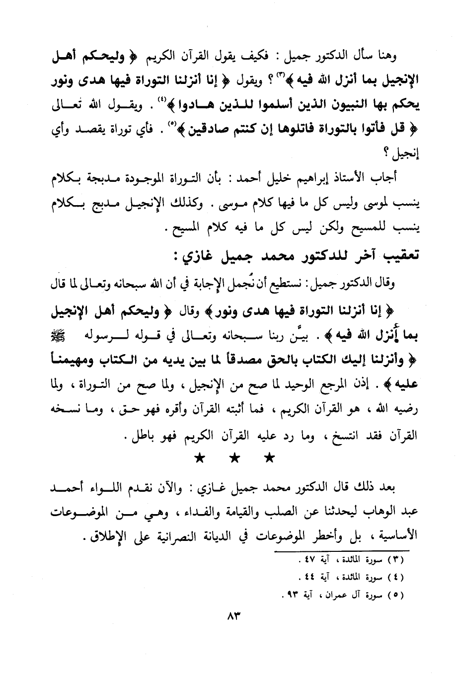 وهنا سأل الدكتور جميل: فكيف يقول القرآن الكريم: {وَلْيَحْكُمْ أَهْلُ الْإِنْجِيلِ بِمَا أَنْزَلَ اللَّهُ فِيهِ} ؟ ويقول: {إِنَّا أَنْزَلْنَا التَّوْرَاةَ فِيهَا هُدًى وَنُورٌ يَحْكُمُ بِهَا النَّبِيُّونَ الَّذِينَ أَسْلَمُوا لِلَّذِينَ هَادُوا} . وبقول الله تعالى: {قُلْ فَأْتُوا بِالتَّوْرَاةِ فَاتْلُوهَا إِنْ كُنْتُمْ صَادِقِينَ} . فأي توراة يقصد وأي إنجيل؟