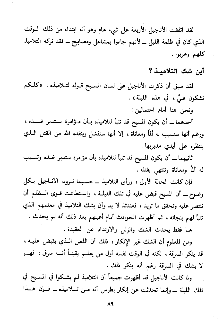 فإن كانت الحالة الأولى، ورأى التلاميذ- حسبما ترويه الأناجيل بكل وضوح- أن المسيح قبض عليه في تلك الليلة، واستطاعت قوى الظلم أن تنتصر عليه وتحقق ما تريد، فعندئذ لا بد وأن يشك التلاميذ في معلمهم الذي تنبأ لهم بنجاته، ثم أظهرت الحوادث أمام أعينهم بعد ذلك أنه لم يحدث. هنا فقط يحدث الشك والزلل والارتداد عن العقيدة.