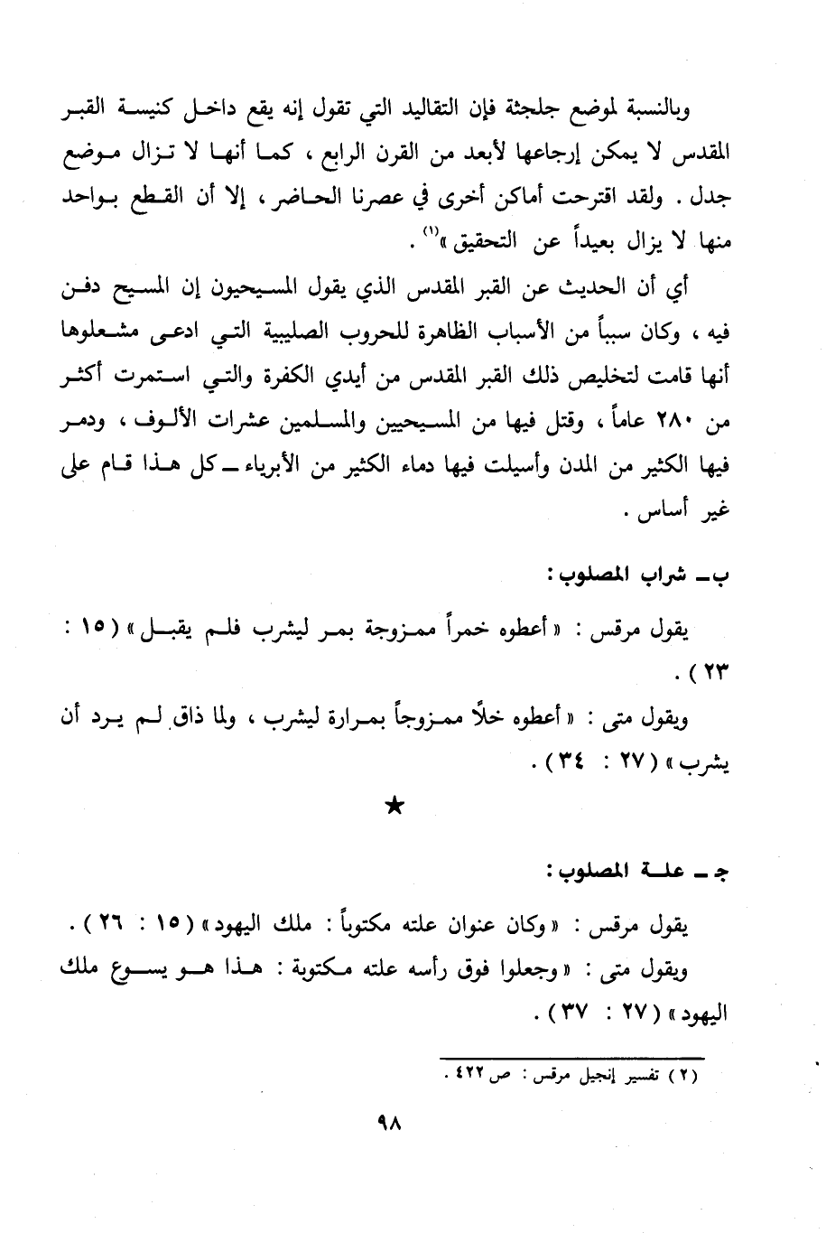 أي أن الحديث عن القبر المقدس الذي يقول المسيحيون إن المسيح دفن فيه، وكان سببا من الأسباب الظاهرة للحروب الصليبية التي ادعى مشعلوها أنها قامت لتخليص ذلك القبر المقدس من أيدي الكفرة والتي استمرت أكثر من 280 عاما، وقتل فيها من المسيحيين والمسلمين عشرات الألوف، ودمر فيها الكثير من المدن وأسيلت فيها دماء الكثير من الأبرياء - كل هذا قام على غير أساس.