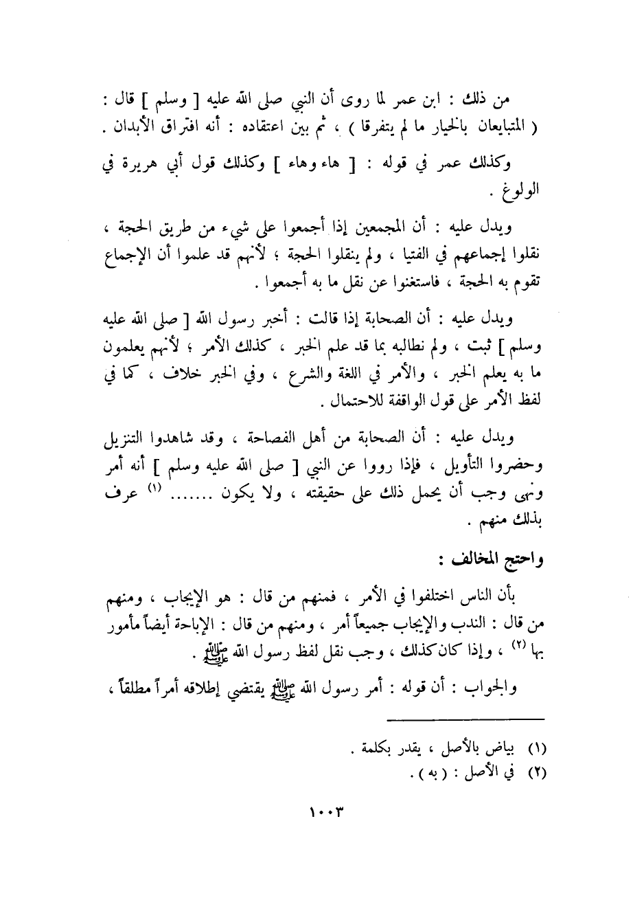 بأن الناس اختلفوا في الأمر، فمنهم من قال: هو الإيجاب، ومنهم من قال: الندب والإيجاب جميعاً أمر، ومنهم من قال: الإباحة أيضاً مأمور بها (2) ، وإذا كان كذلك، وجب نقل لفظ رسول الله - صلى الله عليه وسلم -.