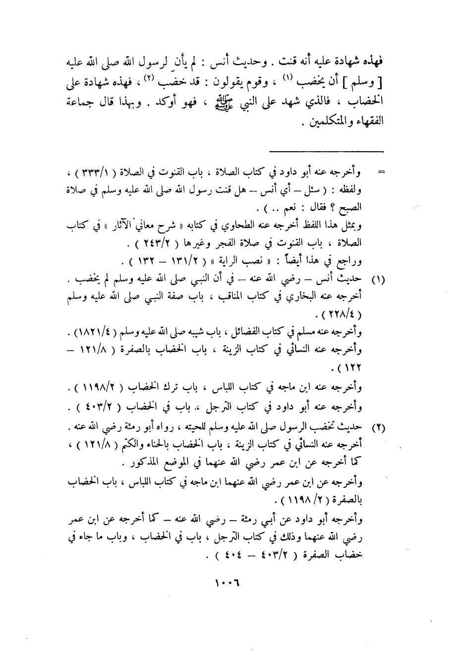 فهذه شهادة عليه أنه قنت. وحديث أنس: لم يأنِ لرسول الله صلى الله عليه [وسلم] أن يخضب (1) ، وقوم يقولون: قد خضب (2) ، فهذه شهادة على الخضاب، فالذي شهد على النبي - صلى الله عليه وسلم -، فهو أوكد. وبهذا قال جماعة الفقهاء والمتكلمين.