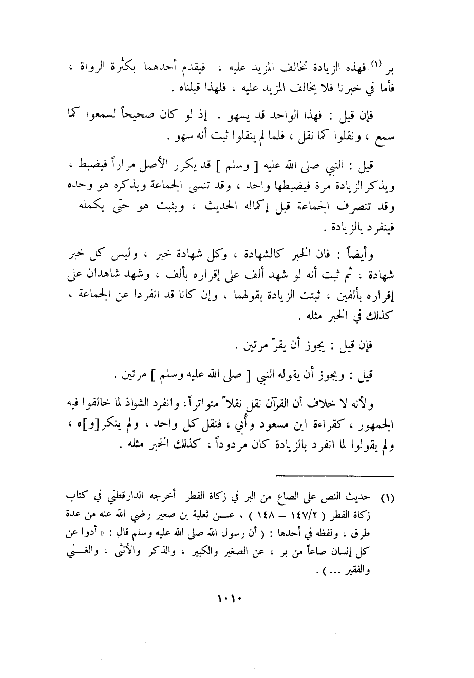 بر (1) فهذه الزيادة تخالف المزيد عليه، فيقدم أحدهما بكثرة الرواة، فأما في خبرنا فلا يخالف المزيد عليه، فلهذا قبلناه.