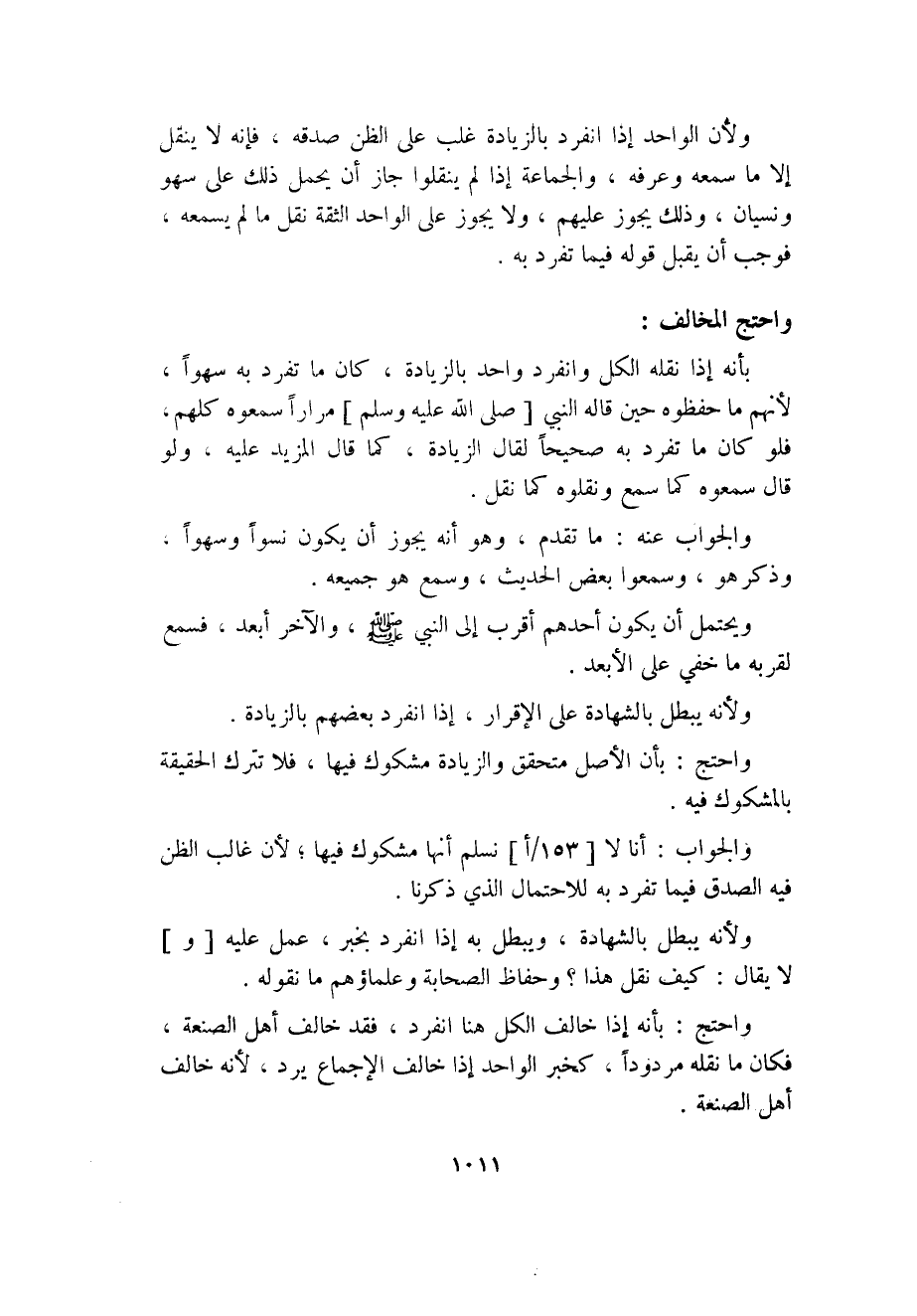 والجواب: أنا لا [153/أ] نسلم أنها مشكوك فيها؛ لأن غالب الظن فيه الصدق فيما تفرد به للاحتمال الذي ذكرنا.