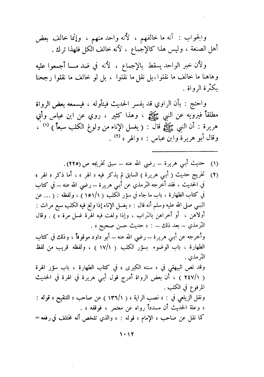واحتج: بأن الراوي قد يفسر الحديث فيتأوله، فيسمعه بعض الرواة مطلقاً فيرويه عن النبي - صلى الله عليه وسلم -، وهذا كثير، روي عن ابن عباس وأبي هريرة: أن النبي - صلى الله عليه وسلم - قال: (يغسل الإناء من ولوغ الكلب سبعاً) (1) ، وقال أبو هريرة وابن عباس: "والهر" (2) .