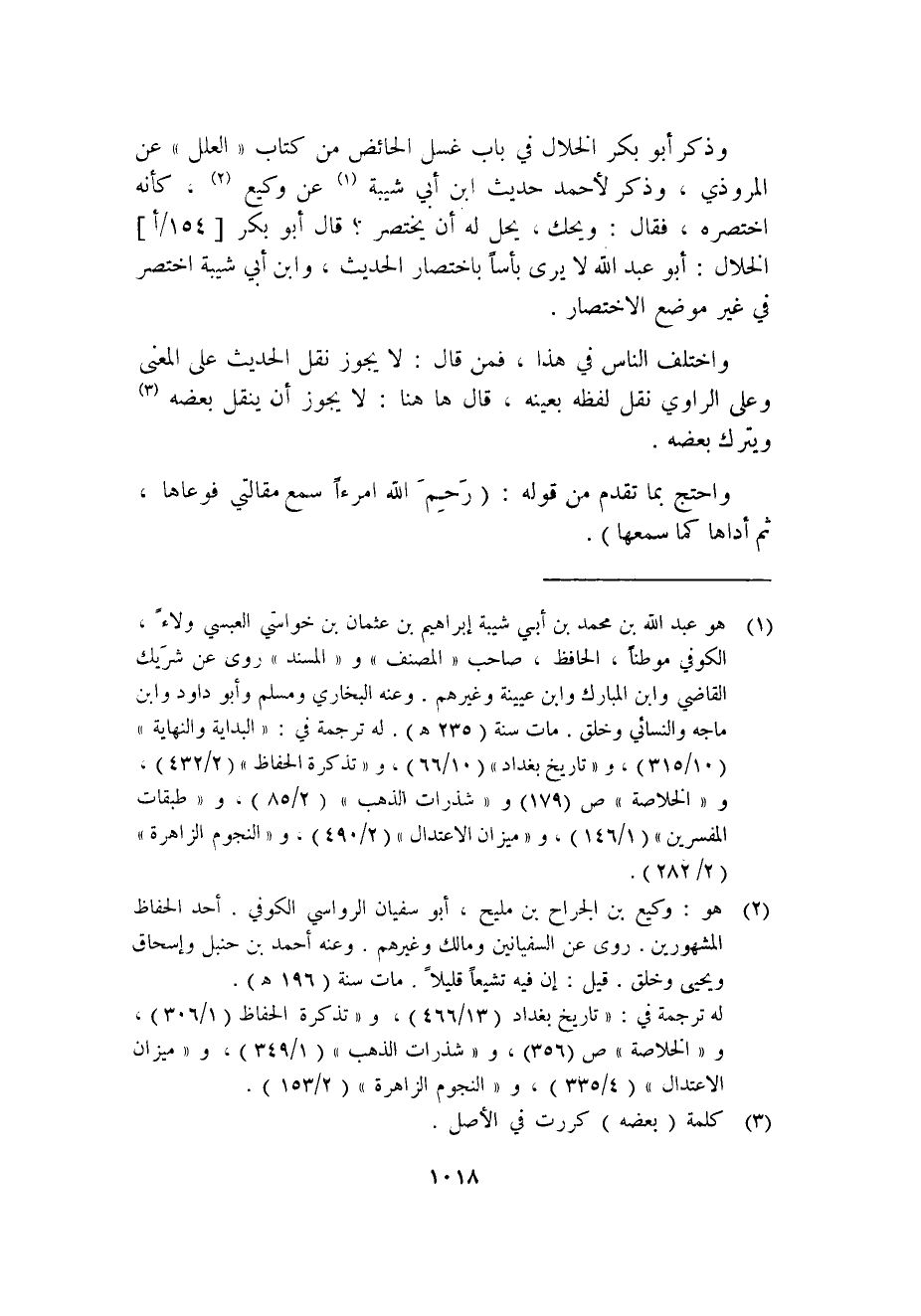 وذكر أبو بكر الخلال في باب غسل الحائض من كتاب "العلل" عن المروذي، وذكر لأحمد حديث ابن أبي شيبة (1) عن وكيع (2) ، كأنه اختصره، فقال: ويحك، يحل له أن يختصر؟ قال أبو بكر [154/أ] الخلال: أبو عبد الله لا يرى بأساً باختصار الحديث وابن أبي شيبة اختصر في غير موضع الاختصار.