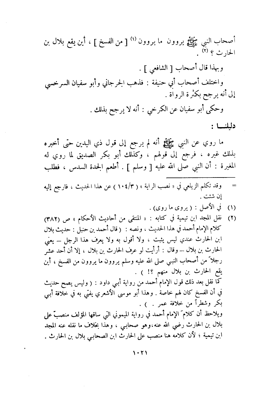 (2) نقل المجد ابن تيمية في كتابه: "المنتقى من أحاديث الأحكام" ص (382) كلام الإمام أحمد في هذا الحديث، ونصه: (قال أحمد بن حنبل: حديث بلال ابن الحارث عندي ليس يثبت، ولا أقول به ولا يعرف هذا الرجل -يعني الحارث بن بلال- وقال: أرأيت لو عرف الحارث بن بلال، إلا أن أحد عشر رجلاً من أصحاب النبي - صلى الله عليه وسلم - يروون ما يروون من الفسخ، أين يقع الحارث بن بلال منهم؟!) .