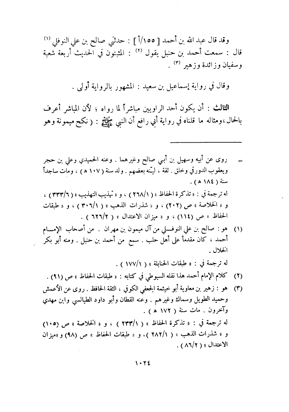 وقد قال عبد الله بن أحمد [155/أ] : حدثني صالح بن علي النوفلي (1) قال: سمعت أحمد بن حنبل يقول (2) : المثبتون في الحديث أربعة شعبة وسفيان وزائدة وزهير (3) .