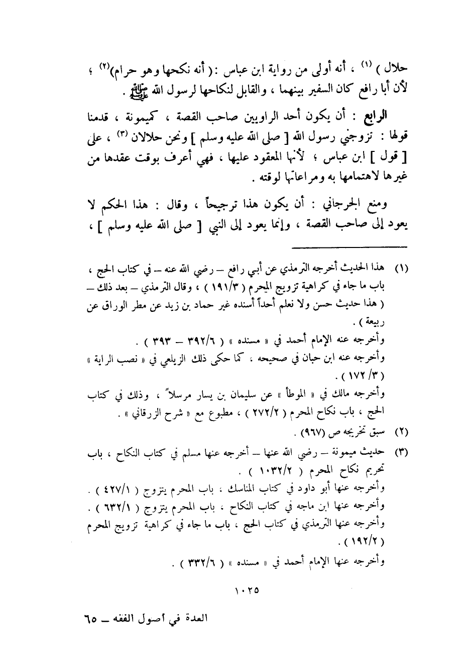 حلال) (1) أنه أولى من رواية ابن عباس: (أنه نكحها وهو حرام) (2) ؛ لأن أبا رافع كان السفير بينهما، والقابل لنكاحها لرسول الله - صلى الله عليه وسلم -.