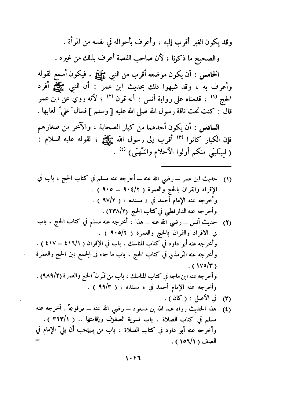 الخامس: أن يكون موضعه أقرب من النبي - صلى الله عليه وسلم -. فيكون أسمع لقوله وأعرف به، وقد شبهوا ذلك بحديث ابن عمر: أن النبي - صلى الله عليه وسلم - أفرد الحج (1) ، قدمناه على رواية أنس: أنه قرن (2) ؛ لأنه روي عن ابن عمر قال: كنت تحت ناقة رسول الله صلى الله عليه [وسلم] فسالَ عليّ لعابها.