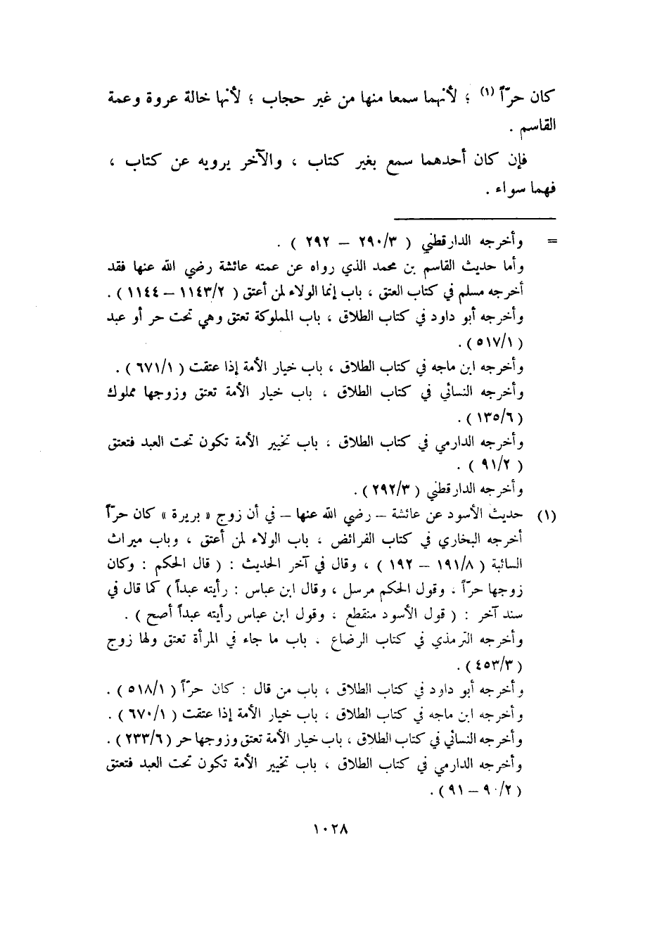 (1) حديث الأسود عن عائشة -رضي الله عنها- في أن زوج "بريرة" كان حرّاً أخرجه البخاري في كتاب الفرائض، باب الولاء لمن أعتق، وباب ميراث السائبة (8/191-192) ، وقال في آخر الحديث: (قال الحكم: وكان زوجها حرّاً، وقول الحكم مرسل، وقال ابن عباس: رأيته عبداً) كما قال في سند آخر: (قول الأسود منقطع، وقول ابن عباس رأيته عبداً أصح) .