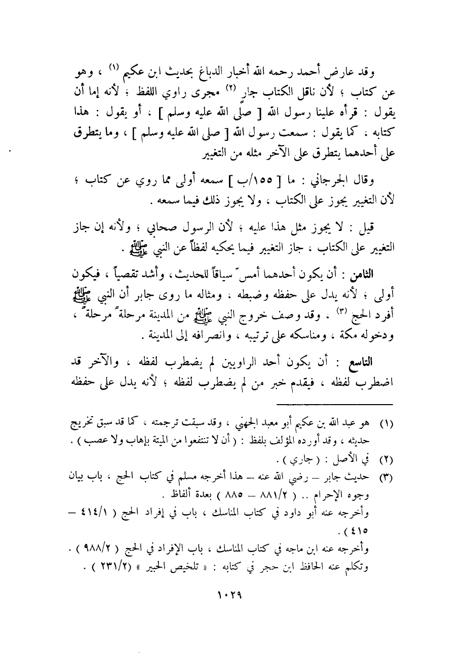 الثامن: أن يكون أحدهما أمسّ سياقاً للحديث، وأشد تقصياً، فيكون أولى؛ لأنه يدل على حفظه وضبطه، ومثاله ما روى جابر أن النبي - صلى الله عليه وسلم - أفرد الحج (3) ، وقد وصف خروج النبي - صلى الله عليه وسلم - من المدينة مرحلةً مرحلةً ودخوله مكة، ومناسكه على ترتيبه، وانصرافه إلى المدينة.