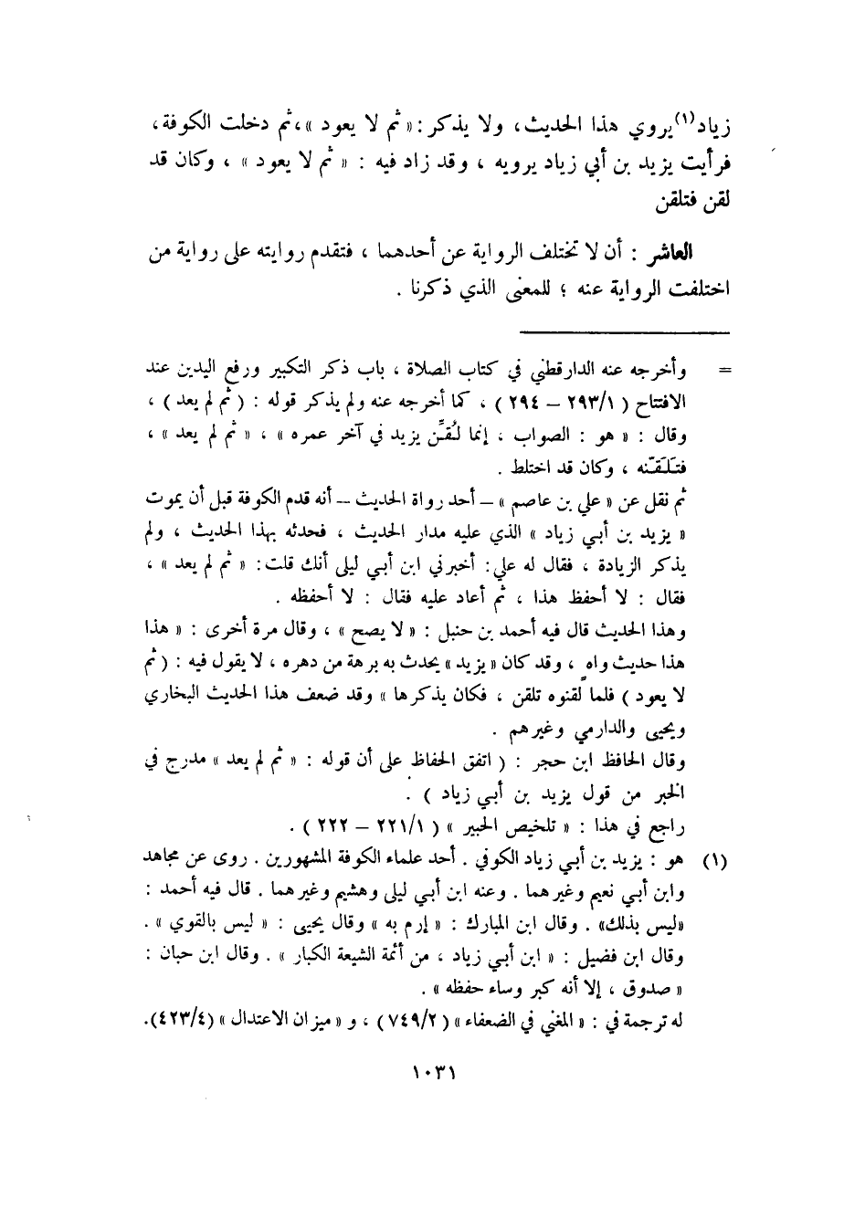 ثم نقل عن "علي بن عاصم" -أحد رواة الحديث- أنه قدم الكوفة قبل أن يموت "يزيد بن أبي زياد" الذي عليه مدار الحديث، فحدثه بهذا الحديث، ولم يذكر الزيادة، فقال له علي: أخبرني ابن أبي ليلى أنك قلت: "ثم لم يعد"، فقال: لا أحفظ هذا، ثم أعاد عليه فقال: لا أحفظه.