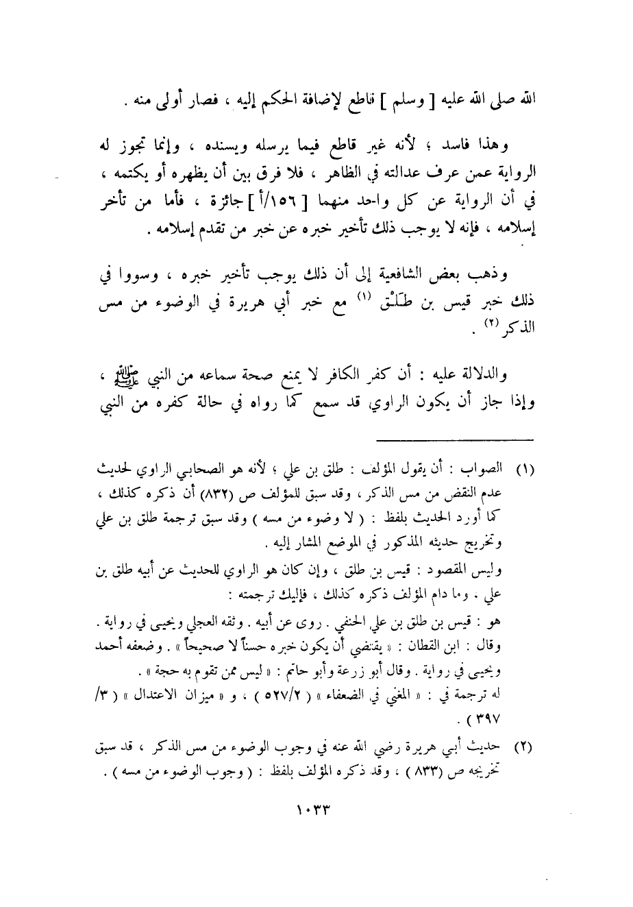 (1) الصواب: أن يقول المؤلف: طلق بن علي؛ لأنه هو الصحابي الراوي لحديث عدم النقض من مس الذكر، وقد سبق للمؤلف ص (832) أن ذكره كذلك، كما أورد الحديث بلفظ: (لا وضوء من مسه) وقد سبق ترجمة طلق بن علي وتخريج حديثه المذكور في الموضع المشار إليه.