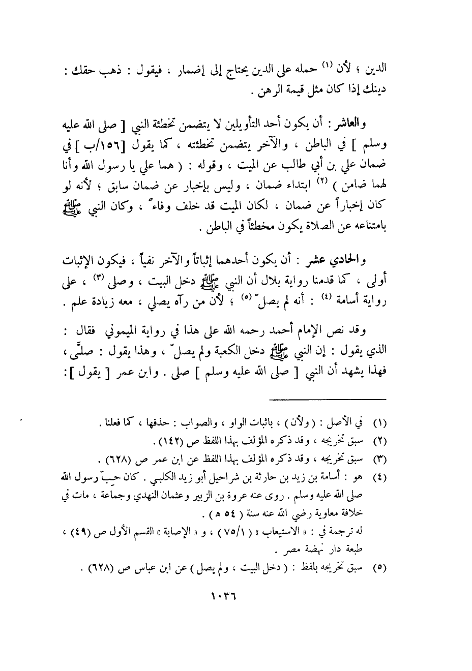 والعاشر: أن يكون أحد التأويلين لا يتضمن تخطئة النبي [صلى الله عليه وسلم] في الباطن، والآخر يتضمن تخطئة، كما يقول [156/ب] في ضمان علي بن أبي طالب عن الميت، وقوله: (هما علي يا رسول الله وأنا لهما ضامن) (2) ابتداء ضمان، وليس بإخبار عن ضمان سابق؛ لأنه لو كان إخباراً عن ضمان، لكان الميت قد خلف وفاءً، وكان النبي - صلى الله عليه وسلم - بامتناعه عن الصلاة يكون مخطئاً في الباطن.