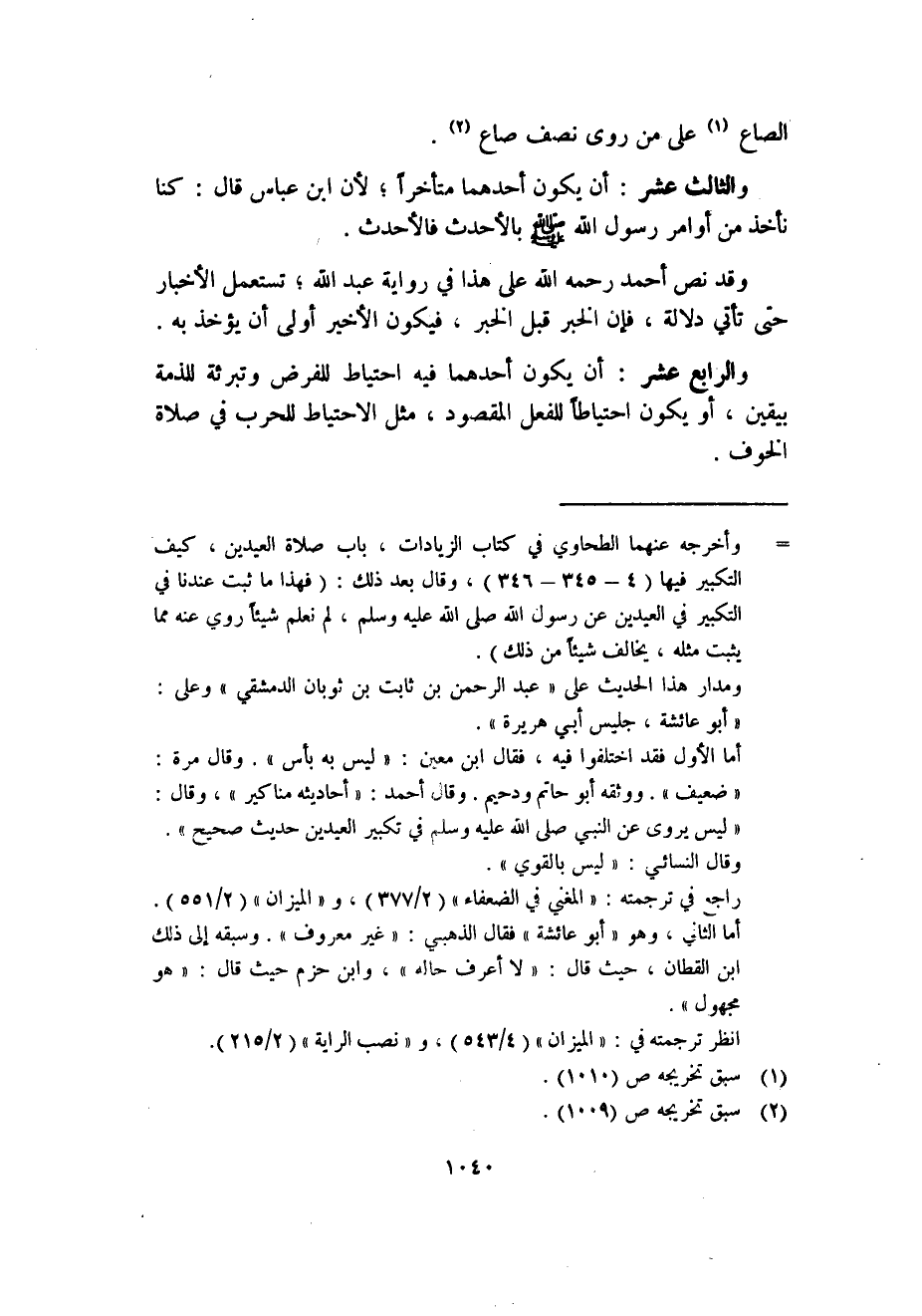 أما الأول فقد اختلفوا فيه، فقال ابن معين: "ليس به بأس". وقال مرة: "ضعيف". ووثقه أبو حاتم ودحيم. وقال أحمد: "أحاديثه مناكير"، وقال: "ليس يروى عن النبي صلى الله عليه وسلم في تكبير العيدين حديث صحيح".