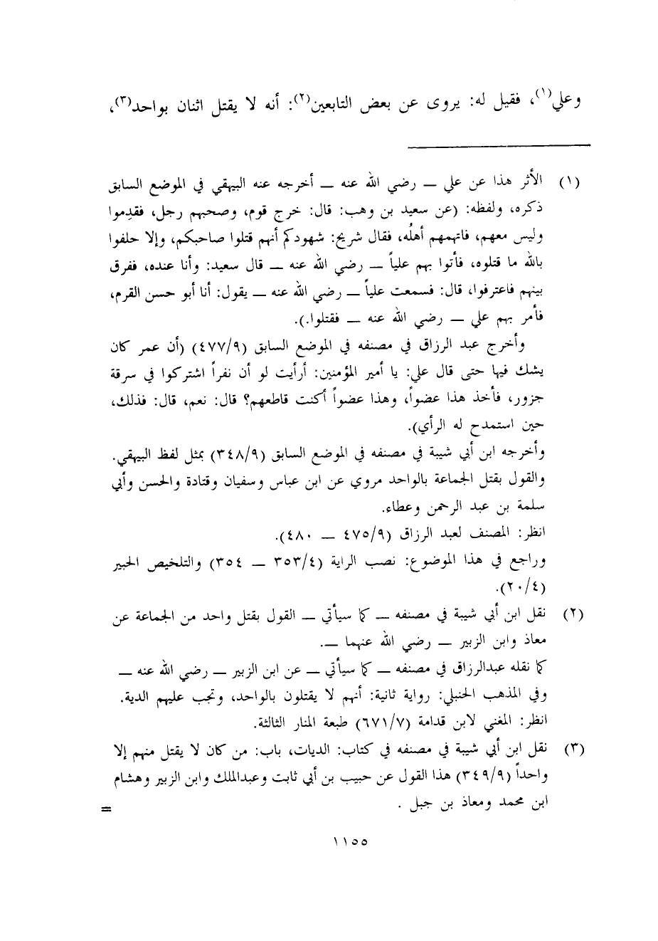 (3) نقل ابن أبي شيبة في مصنفه في كتاب: الديات، باب: من كان لا يقتل منهم إلا واحداً (9/349) هذا القول عن حبيب ابن أبي ثابت وعبد الملك وابن الزبير وهشام ابن محمد ومعاد بن جبل. =