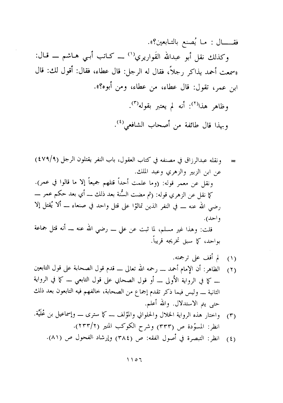 (2) الظاهر: أن الإمام أحمد -رحمه الله تعالى- قدم قول الصحابة على قول التابعين -كما في الرواية الأولى- أو قول الصحابي على قول التابعي -كما في الرواية الثانية- وليس فيما ذكر تقدم إجماع من الصحابة، خالفهم فيه التابعون بعد ذلك حتى يتم الاستدلال. والله أعلم.