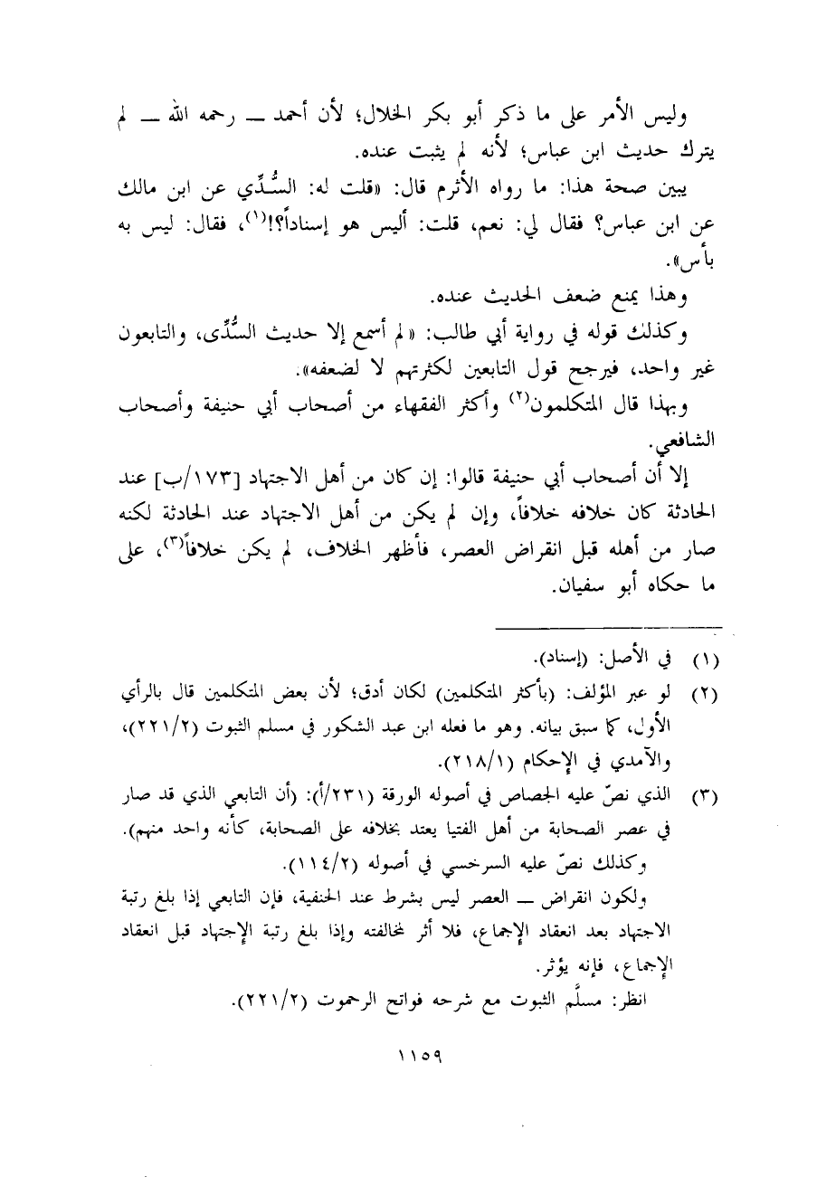 (3) الذي نصّ عليه الجصاص في أصوله الورقة (231/أ) : (أن التابعي الذي قد صار في عصر الصحابة من أهل الفتيا يعتد بخلافه على الصحابة، كأنه واحد منهم) .