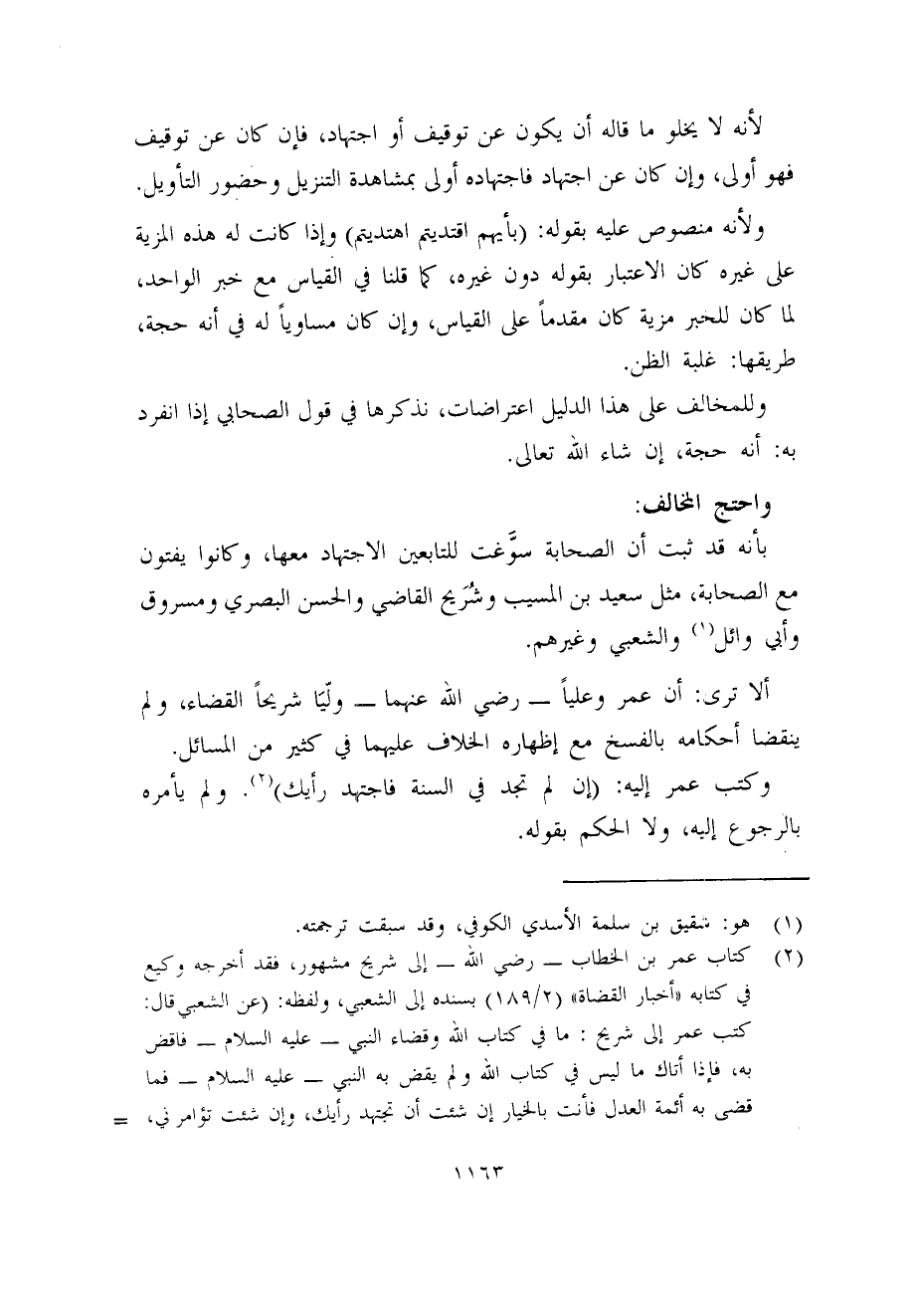 ألا ترى: أن عمر وعلياً -رضي الله عنهما- ولّيَا شريحاً القضاء، ولم ينقضا أحكامه بالفسخ مع إظهاره الخلاف عليهما في كثير من المسائل.