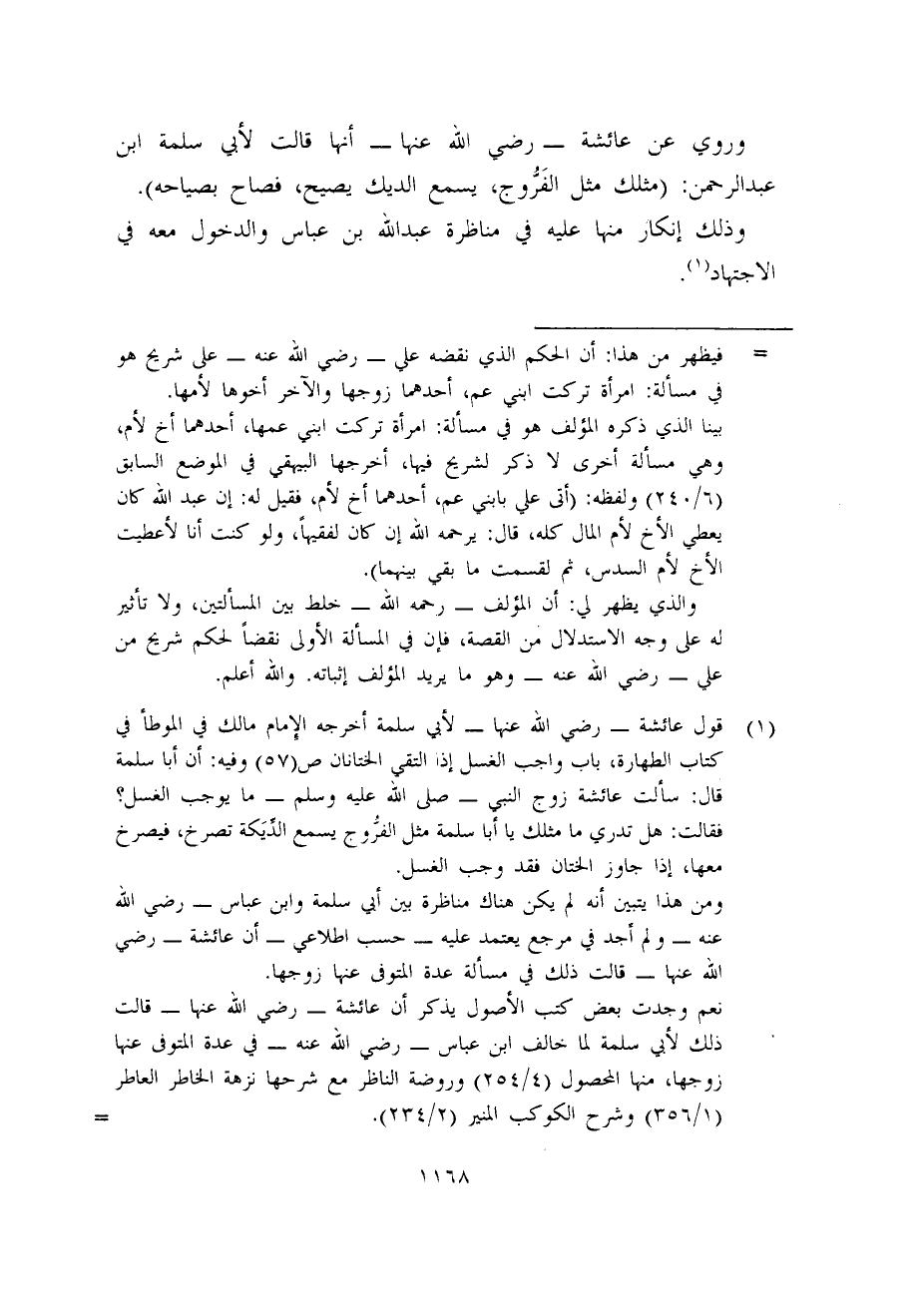 (1) قول عائشة -رضي الله عنها- لأبي سلمة أخرجه الإمام مالك في الموطأ في كتاب الطهارة، باب واجب الغسل إذا التقى الختانان ص (57) وفيه: أن أبا سلمة قال: سألت عائشة زوج النبي - صلى الله عليه وسلم - ما يوجب الغسل؟ فقالت: هل تدري ما مثلك يا أبا سلمة مثل الفروج يسمع الدِّيَكة تصرخ، فيصرخ معها، إذا جاوز الختان فقد وجب الغسل.