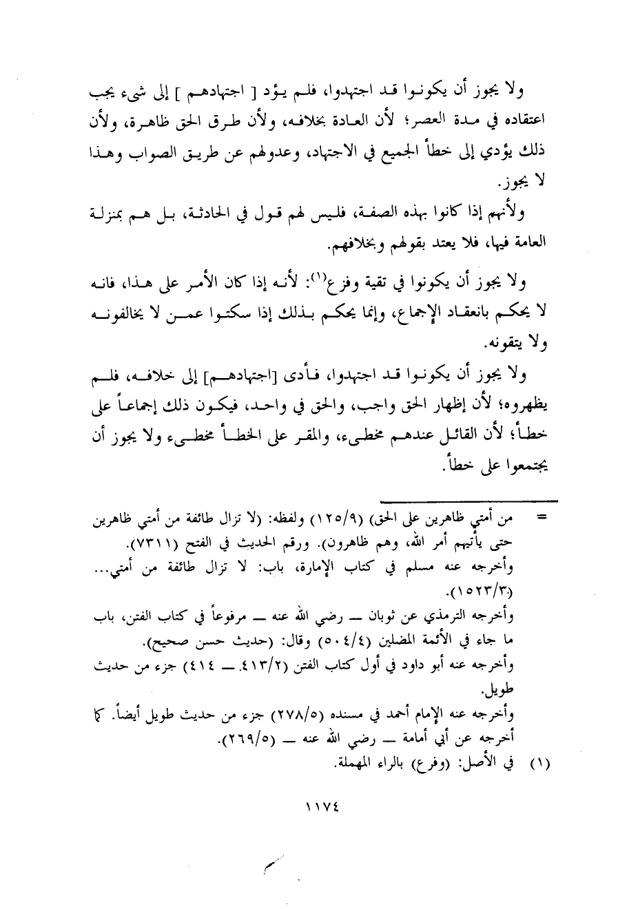 ولا يجوز أن يكونوا قد اجتهدوا، فأدى [اجتهادهم] إلى خلافه، فلم يظهروه؛ لأن إظهار الحق واجب، والحق في واحد، فيكون ذلك إجماعاً على خطأ؛ لأن القائل عندهم مخطىء، والمقر على الخطأ مخطىء ولا يجوز أن يجتمعوا على خطأ.
