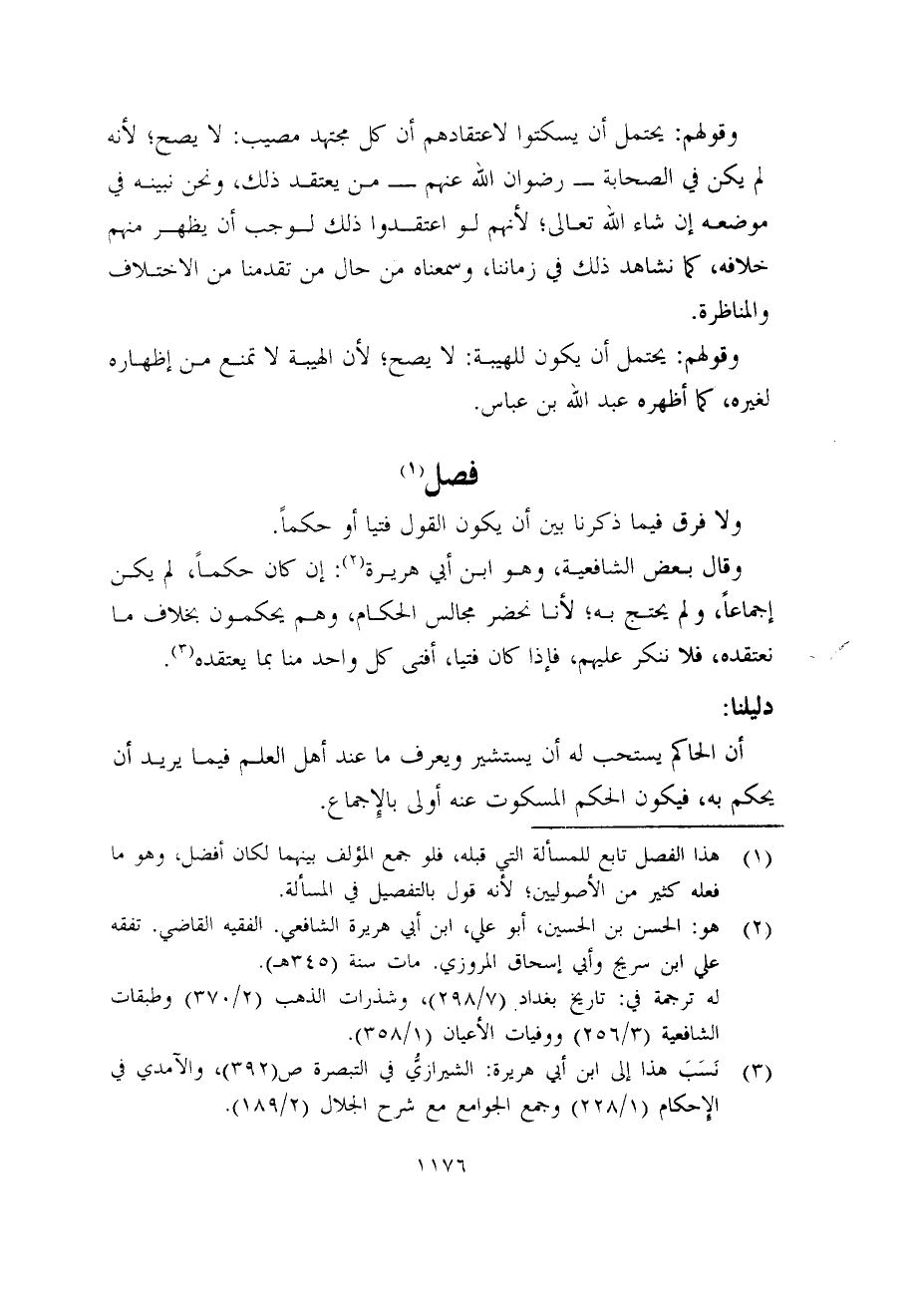 وقال بعض الشافعية، وهو ابن أبي هريرة (2) : إن كان حكماً، لم يكن إجماعاً، ولم يحتج به؛ لأنا نحضر مجالس الحكام، وهم يحكمون بخلاف ما نعتقده، فلا ننكر عليهم، فإذا كان فتيا، أفتى كل واحد منا بما يعتقده (3) .