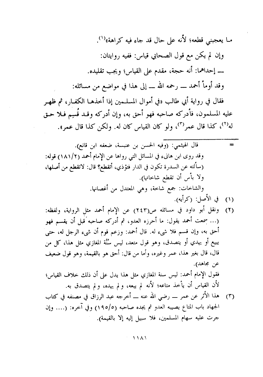 (2) ونقل أبو داود في مسائله ص (243) عن الإمام أحمد مثل الرواية، ولفظه: ( ... سمعت أحمد يقول: ما أحرزه العدو، ثم أدركه صاحبه قبل أن يقسم فهو أحق به، وإن قسم فلا شىء له. قال أحمد: وزعم قوم أن شىء الرجل له حتى يبيع أو يهدي أو يتصدق، وهو قول متعد، ليس سُنَّة المغازي مثل هذا، كل من قال، قال بغير هذا، عمر وغيره، وأما من قال: أحق هو بالقيمة، وهو قول ضعيف عن مجاهد) .