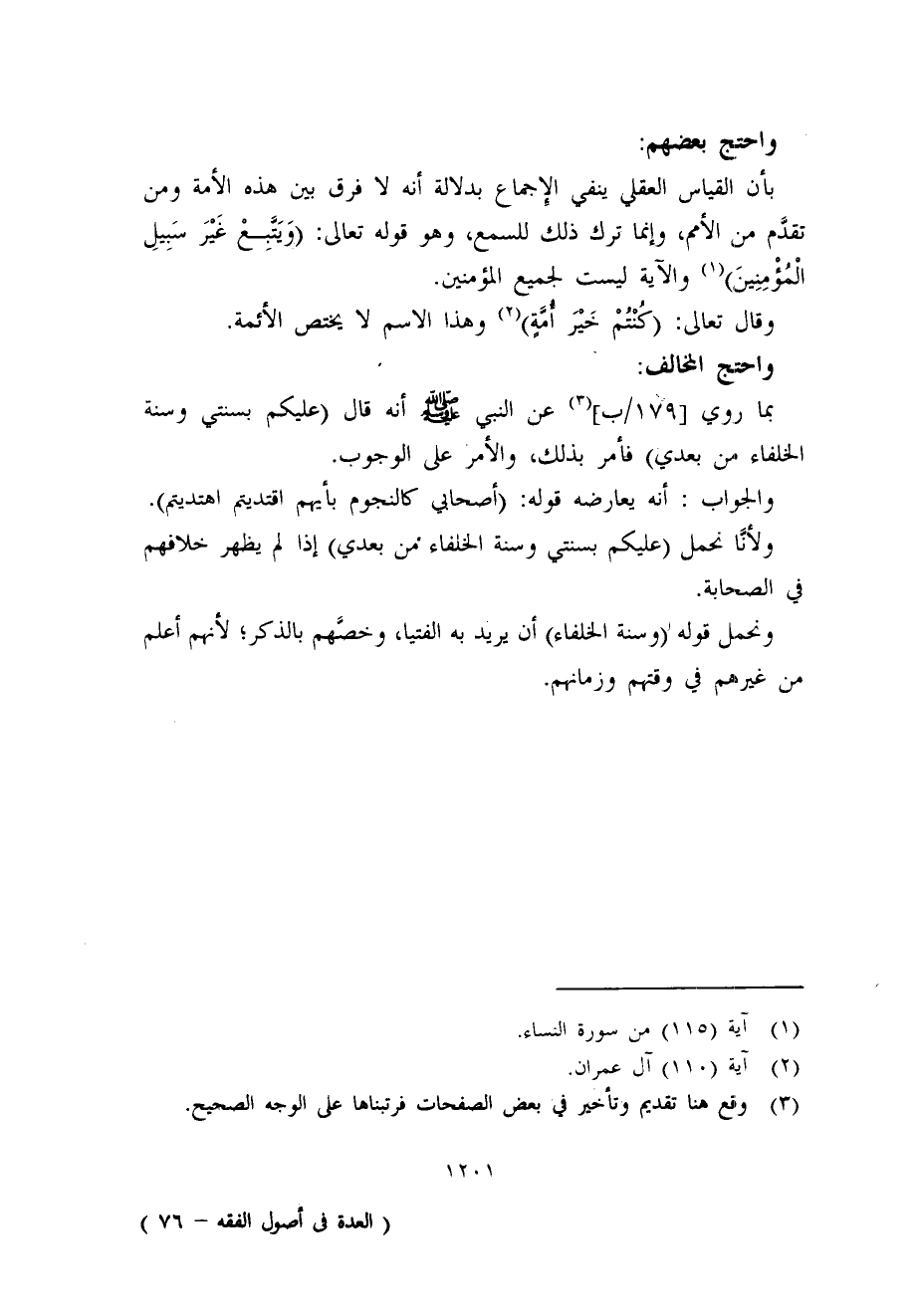 ولأنَّا نحمل (عليكم بسنتي وسنة الخلفاء من بعدي) إذا لم يظهر خلافهم في الصحابة.