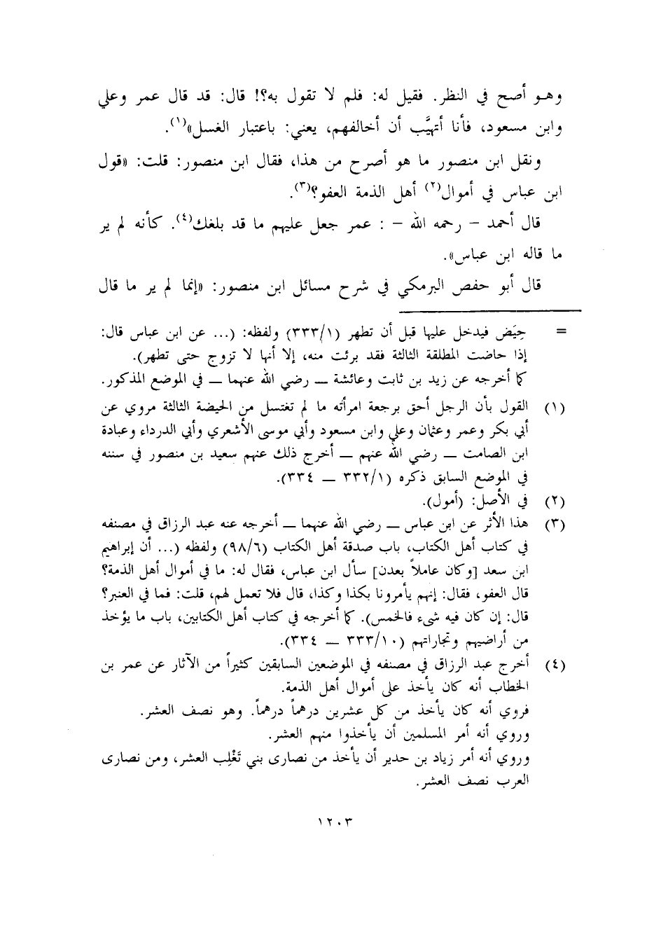 ونقل ابن منصور ما هو أصرح من هذا، فقال ابن منصور: قلت: "قول ابن عباس فى أموال (2) أهل الذمة العفو؟ (3) .