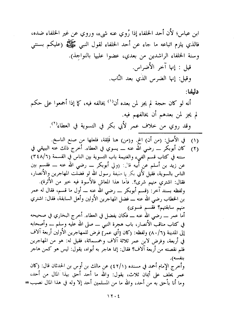 ولفظه بسند آخر: (قسم أبو بكر - رضي الله عنه - أول ما قسم، فقال له عمر بن الخطاب - رضي الله عنه - فضل المهاجرين الأولين وأهل السابقة، فقال: اشتري منهم سابقتهم؟ فقسم فسوى)