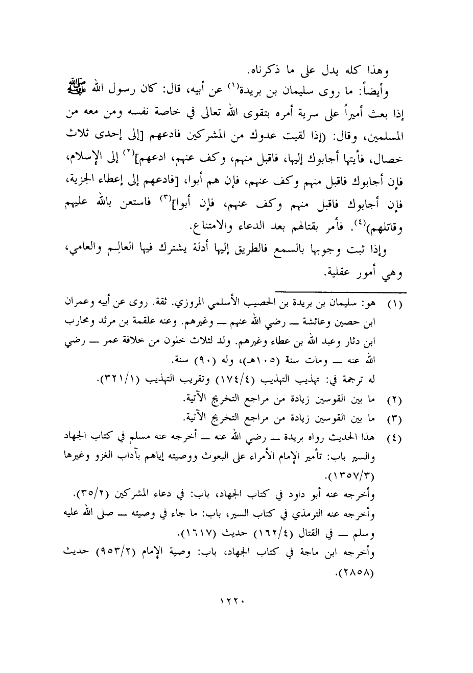 وأيضاً: ما روى سليمان بن بريدة (1) عن أبيه، قال: كان رسول الله - صلى الله عليه وسلم - إذا بعث أميراً على سرية أمره بتقوى الله تعالى في خاصة نفسه ومن معه من المسلمين، وقال: (إذا لقيت عدوك من المشركين فادعهم [إلى إحدى ثلاث خصال، فأيتها أجابوك إليها، فاقبل منهم، وكف عنهم، ادعهم] (2) إلى الإسلام، فإن أجابوك فاقبل منهم وكف عنهم، فإن هم أبوا، [فادعهم إلى إعطاء الجزية، فإن أجابوك فاقبل منهم وكف عنهم، فإن أبوا] (3) فاستعن بالله عليهم وقاتلهم) (4) . فأمر بقتالهم بعد الدعاء والامتناع.