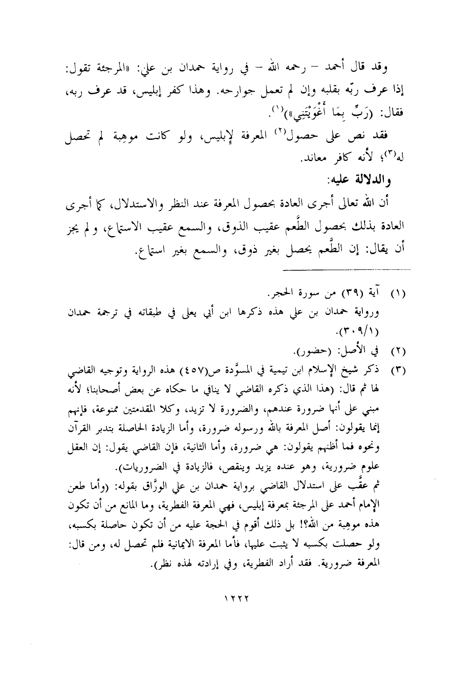 ثم عقَّب على استدلال القاضي برواية حمدان بن على الورَّاق بقوله: (وأما طعن الإمام أحمد على المرجئة بمعرفة إبليس، فهي المعرفة الفطرية، وما المانع من أن تكون هذه موهِبة من الله؟! ذلك أقوم في الحجة عليه من أن تكون حاصلة بكسبه، ولو حصلت بكسبه لا يثبت عليها، فأما المعرفة الإيمانية فلم تحصل له، ومن قال: المعرفة ضرورية. فقد أراد الفطرية، وفي إرادته لهذه نظر) .