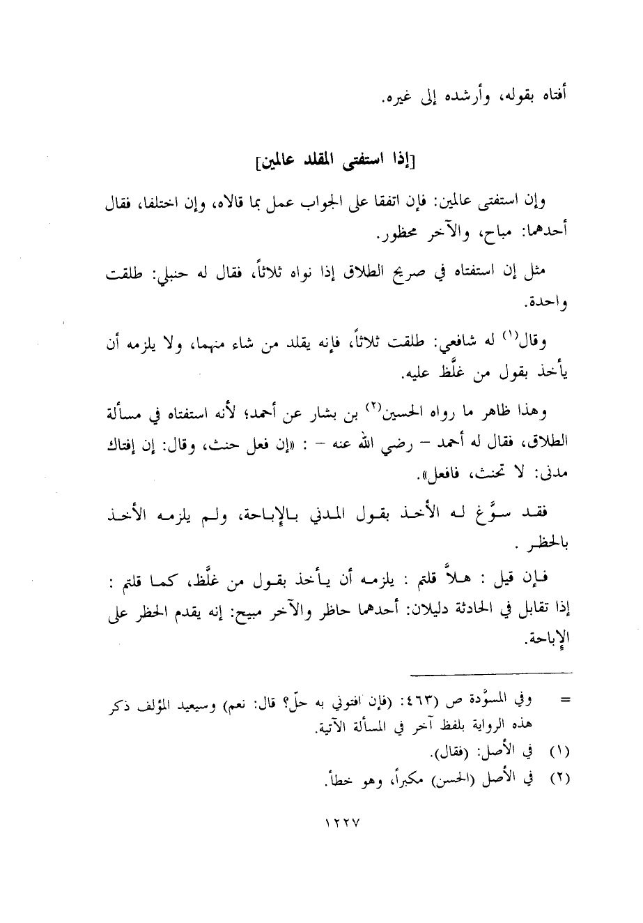 وهذا ظاهر ما رواه الحسين (2) بن بشار عن أحمد؛ لأنه استفتاه في مسألة الطلاق، فقال له أحمد - رضي الله عنه -: "إن فعل حنث، وقال: إن إفتاك مدني: لا تحنث، فافعل".