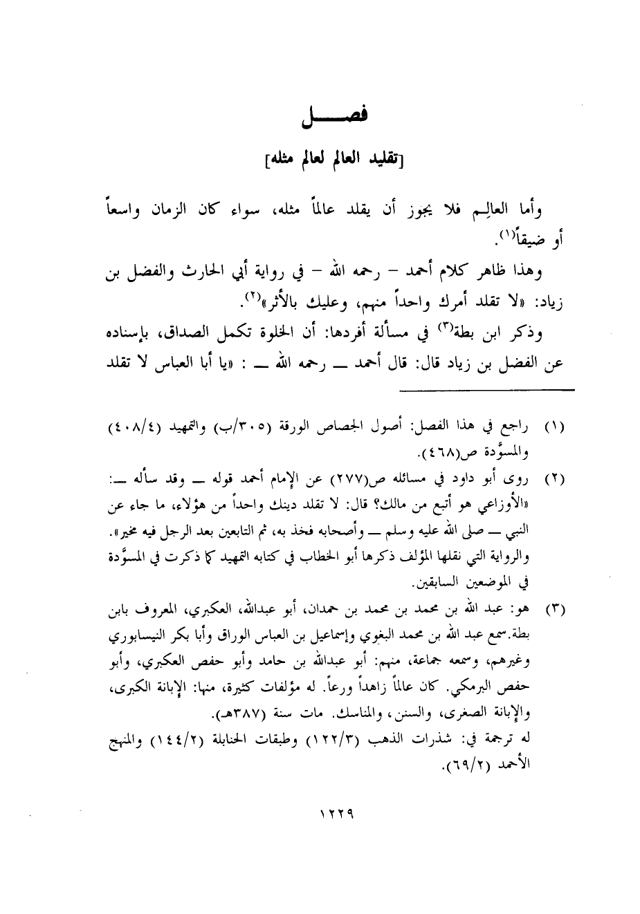 وهذا ظاهر كلام أحمد -رحمه الله- في رواية أبي الحارث والفضل بن زياد: "لا تقلد أمرك واحداً منهم، وعليك بالأثر" (2) .