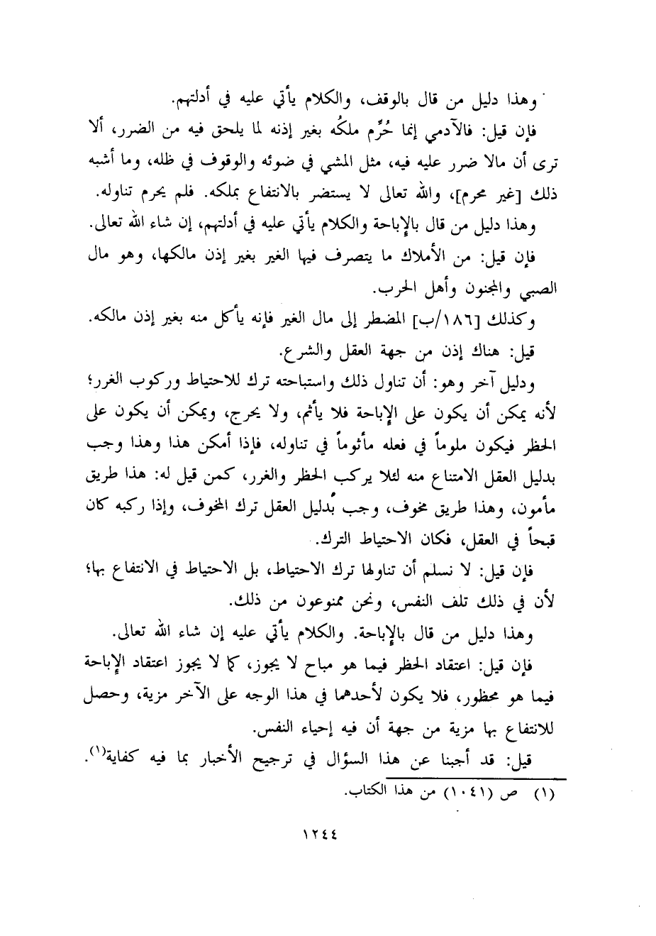 ودليل آخر وهو: أن تناول ذلك واستباحته ترك للاحتياط وركوب الغرر؛ لأنه يمكن أن يكون على الإباحة فلا يأثم، ولا يحرج، ويمكن أن يكون على الحظر فيكون ملوماً في فعله مأثوماً في تناوله، فإذا أمكن هذا وهذا وجب بدليل العقل الامتناع منه لئلا يركب الحظر والغرر، كمن قيل له: هذا طريق مأمون، وهذا طريق مخوف، وجب بدليل العقل ترك المخوف، وإذا ركبه كان قبحاً في العقل، فكان الاحتياط الترك.
