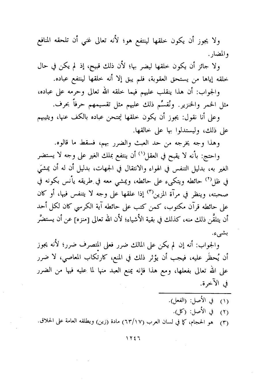 واحتج: بأنه لا يقبح في العقل (1) أن ينتفع بملك الغير على وجه لا يستضر الغير به، بدليل التنفس في الهواء والانتقال في الجهات، بدليل أن له أن يمشيَ في ظل (2) حائطه ويتكىء على حائطه، ويمشى معه في طريقه يأنس بكونه في صحبته، وينظر في مرآة المزين (3) إذا علقها على وجه لا يتنفس فيها، أو كان على حائطه قرآن مكتوب، كمن كتب على حائطه آية الكرسي كان لكل أحد أن يتلقَّن ذلك منه، كذلك في بقية الأشياء؛ لأن الله تعالى [منزه] عن أن يستضَّر بشىء.