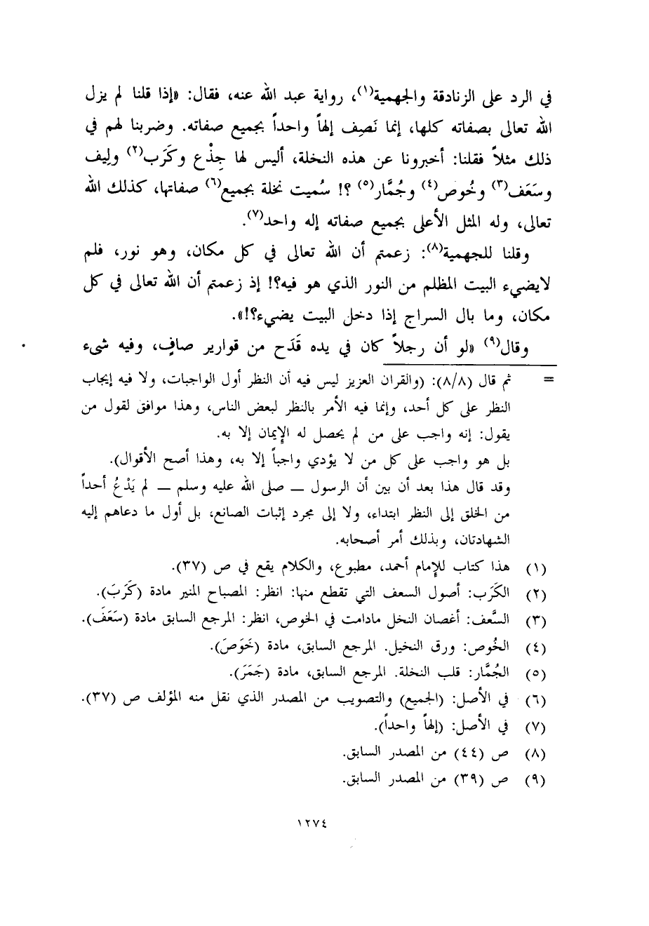وقلنا للجهمية (8) : زعمتم أن الله تعالى في كل مكان، وهو نور، فلم لايضيء البيت المظلم من النور الذي هو فيه؟! إذ زعمتم أن الله تعالى في كل مكان، وما بال السراج إذا دخل البيت يضيء؟! ".