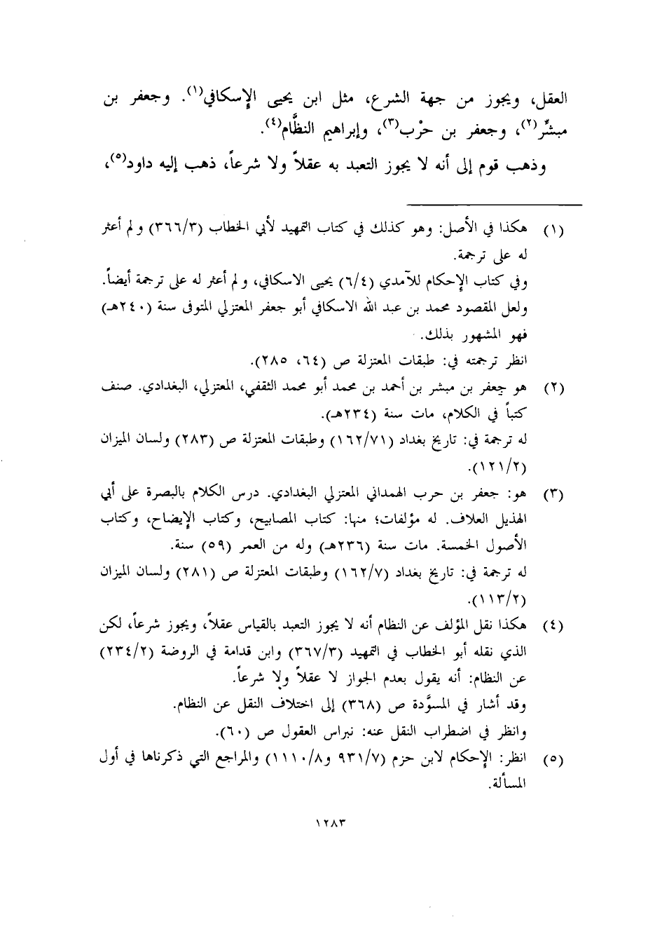 العقل، ويجوز من جهة الشرع، مثل ابن يحيى الإسكافي (1) . وجعفر بن مبشر (2) ، وجعفر بن حرْب (3) ، وإبراهيم النظَّام (4) .