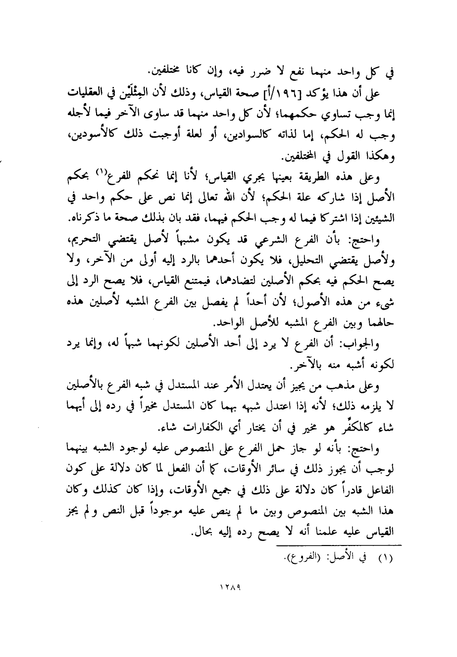 واحتج: بأن الفرع الشرعي قد يكون مشبهاً لأصل يقتضي التحريم، ولأصل يقتضي التحليل، فلا يكون أحدهما بالرد إليه أولى من الآخر، ولا يصح الحكم فيه بحكم الأصلين لتضادهما، فيمتنع القياس، فلا يصح الرد إلى شىء من هذه الأصول؛ لأن أحداً لم يفصل بين الفرع المشبه لأصلين هذه حالهما وبين الفرع المشبه للأصل الواحد.