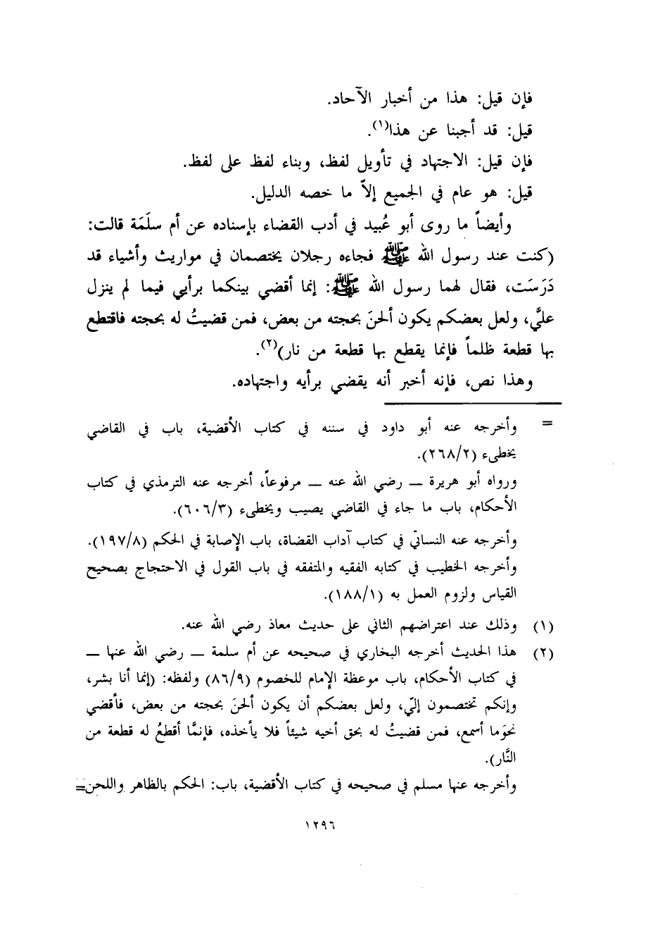 وأيضاً ما روى أبو عُبيد في أدب القضاء بإسناده عن أم سلَمَة قالت: (كنت عند رسول الله - صلى الله عليه وسلم - فجاءه رجلان يختصمان في مواريث وأشياء قد دَرَسَت، فقال لهما رسول الله - صلى الله عليه وسلم -: إنما أقضي بينكما برأيي فيما لم ينزل عليَّ، ولعل بعضكم يكون ألحنَ بحجته من بعض، فمن قضيتُ له بحجته فاقتطع بها قطعة ظلماً فإنما يقطع بها قطعة من نار) (2) .