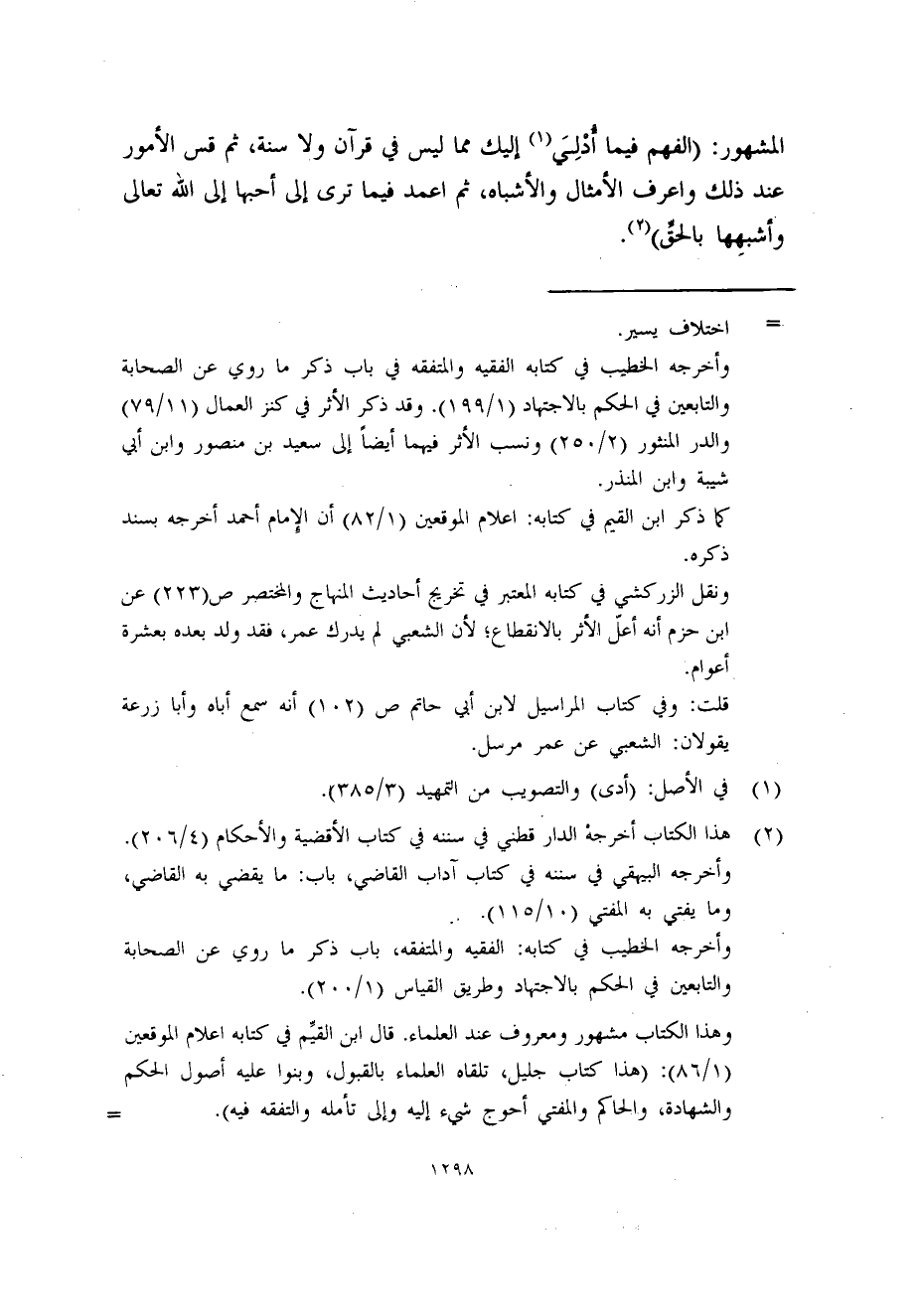 المشهور: (الفهم فيما أدْلِي (1) إليك مما ليس في قرآن ولا سنة، ثم قس الأمور عند ذلك واعرف الأمثال والأشباه، ثم اعمد فيما ترى إلى أحبها إلى الله تعالى وأشبهِها بالحقِّ) (2) .