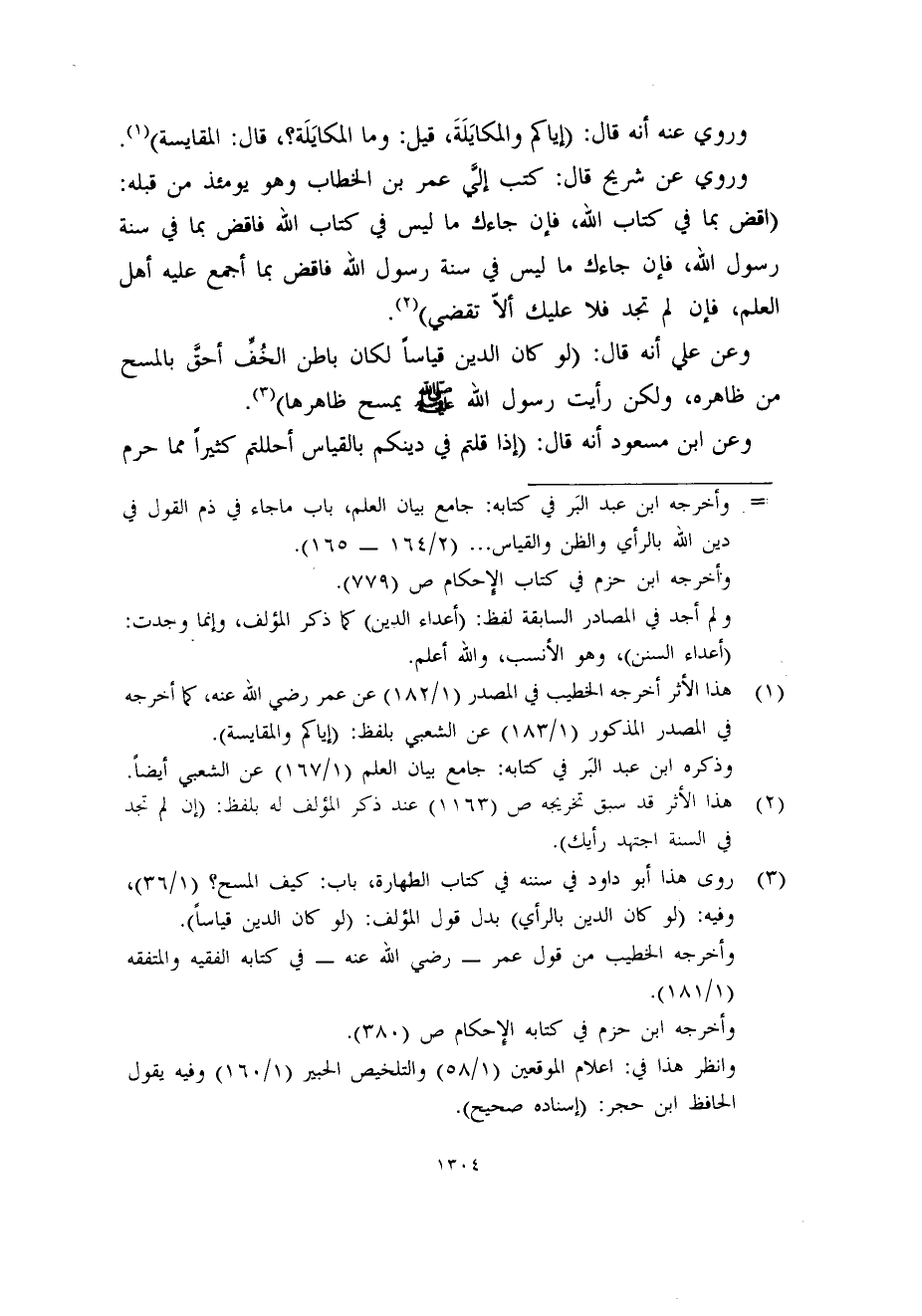 (1) هذا الأثر أخرجه الخطيب في المصدر (1/182) عن عمر رضي الله عنه، كما أخرجه في المصدر المذكور (1/183) عن الشعبي بلفظ: (إياكم والمقايسة) .