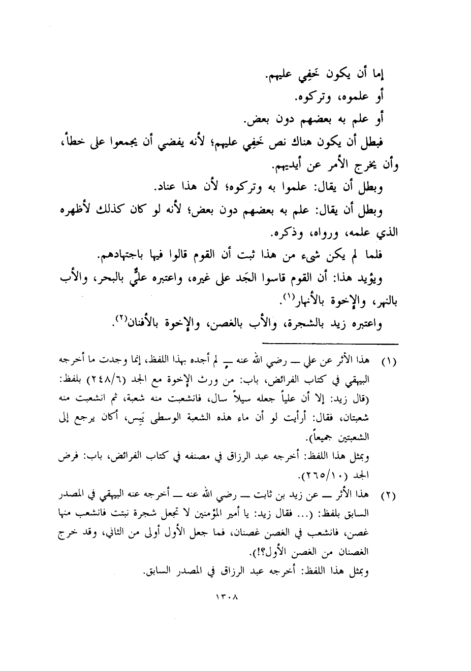 (2) هذا الأثر -عن زيد بن ثابت- رضي الله عنه - أخرجه عنه البيهقي في المصدر السابق بلفظ: ( ... فقال زيد: يا أمير المؤمنين لا تجعل شجرة نبتت فانشعب منها غصن، فانشعب في الغصن غصنان، فما جعل الأول أولى من الثاني، وقد خرج الغصنان من الغصن الأول؟!) .