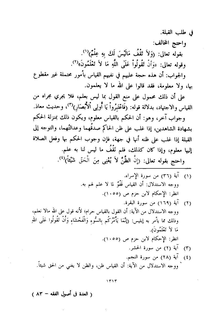 ووجه الاستدلال من الآية: أن القول بالقياس حرام؛ لأنه قول على الله مالا نعلم، وذلك مما يأمر به إبليس: (إنَّمَا يَأمرُكُم بِالسوءِ وَالْفَحْشَاءِ وَأن تَقُولُوا عَلَى الله مَا لاَ تَعْلَمُونَ) .