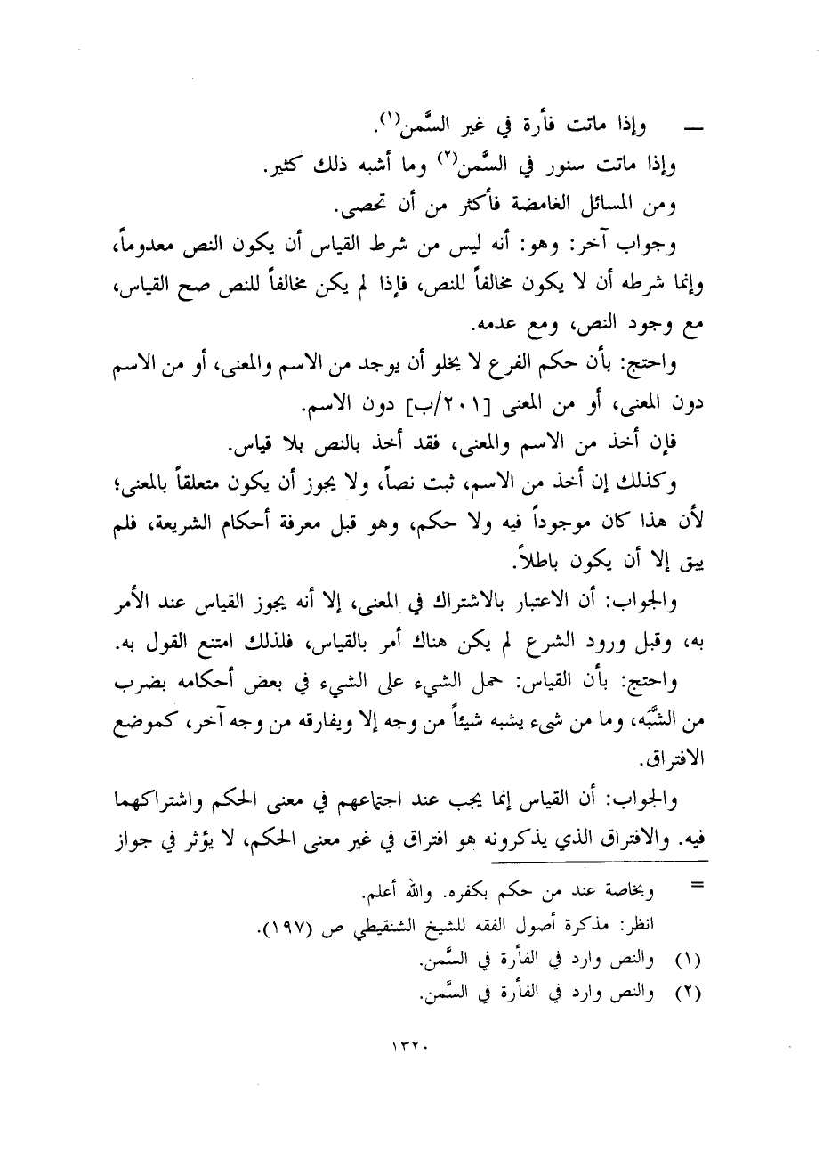 وجواب آخر: وهو: أنه ليس من شرط القياس أن يكون النص معدوماً، وإنما شرطه أن لا يكون مخالفاً للنص، فإذا لم يكن مخالفاً للنص صح القياس، مع وجود النص، ومع عدمه.
