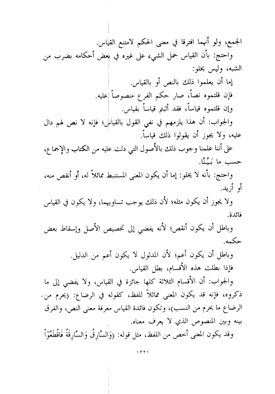 والجواب: أن الأقسام الثلاثة كلها جائزة في القياس، ولا يفضي إلى ما ذكروه، فإنه قد يكون المعنى مماثلاً للفظ، كقوله في الرضاع: (يحرم من الرضاع ما يحرم من النسب) ، وتكون فائدة القياس معرفة معنى النص، والفرق بينه وبين المنصوص الذي لا يعرف معناه.