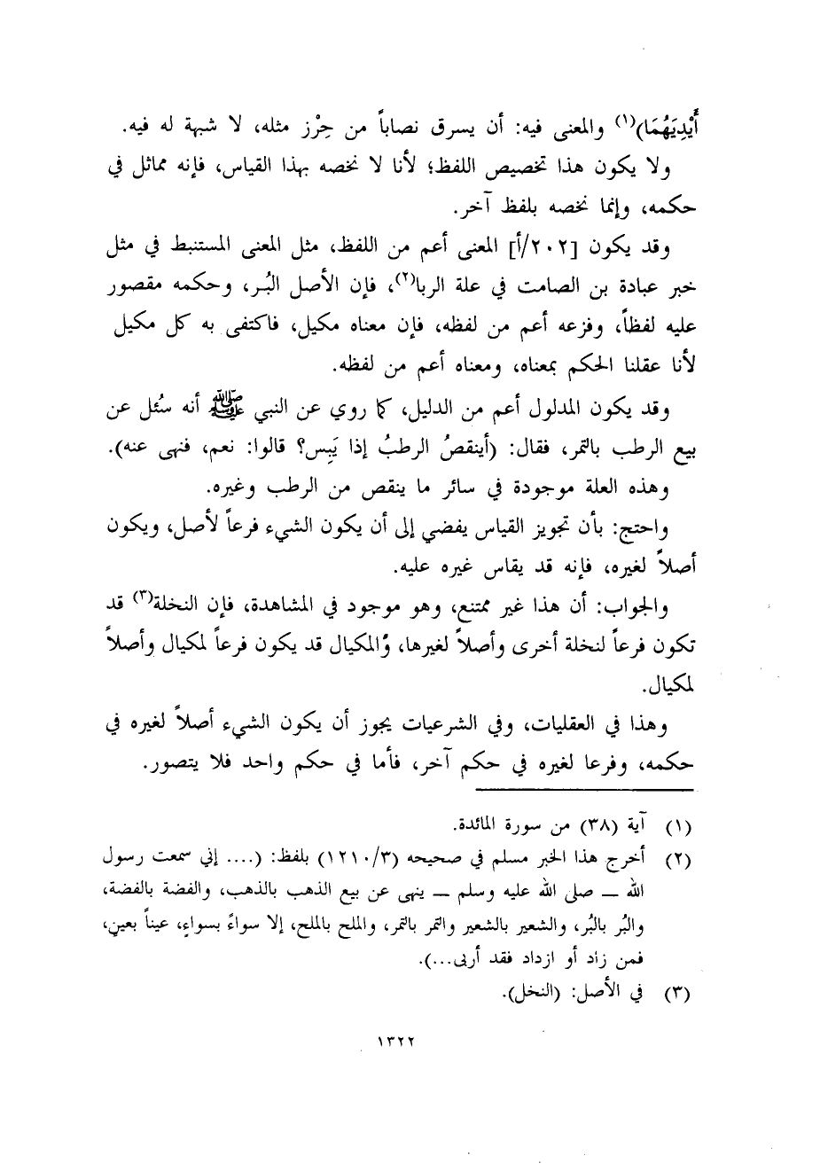 والجواب: أن هذا غير ممتنع، وهو موجود في المشاهدة، فإن النخلة (3) قد تكون فرعاً لنخلة أخرى وأصلاً لغيرها، والمكيال قد يكون فرعاً لمكيال وأصلاً لمكيال.