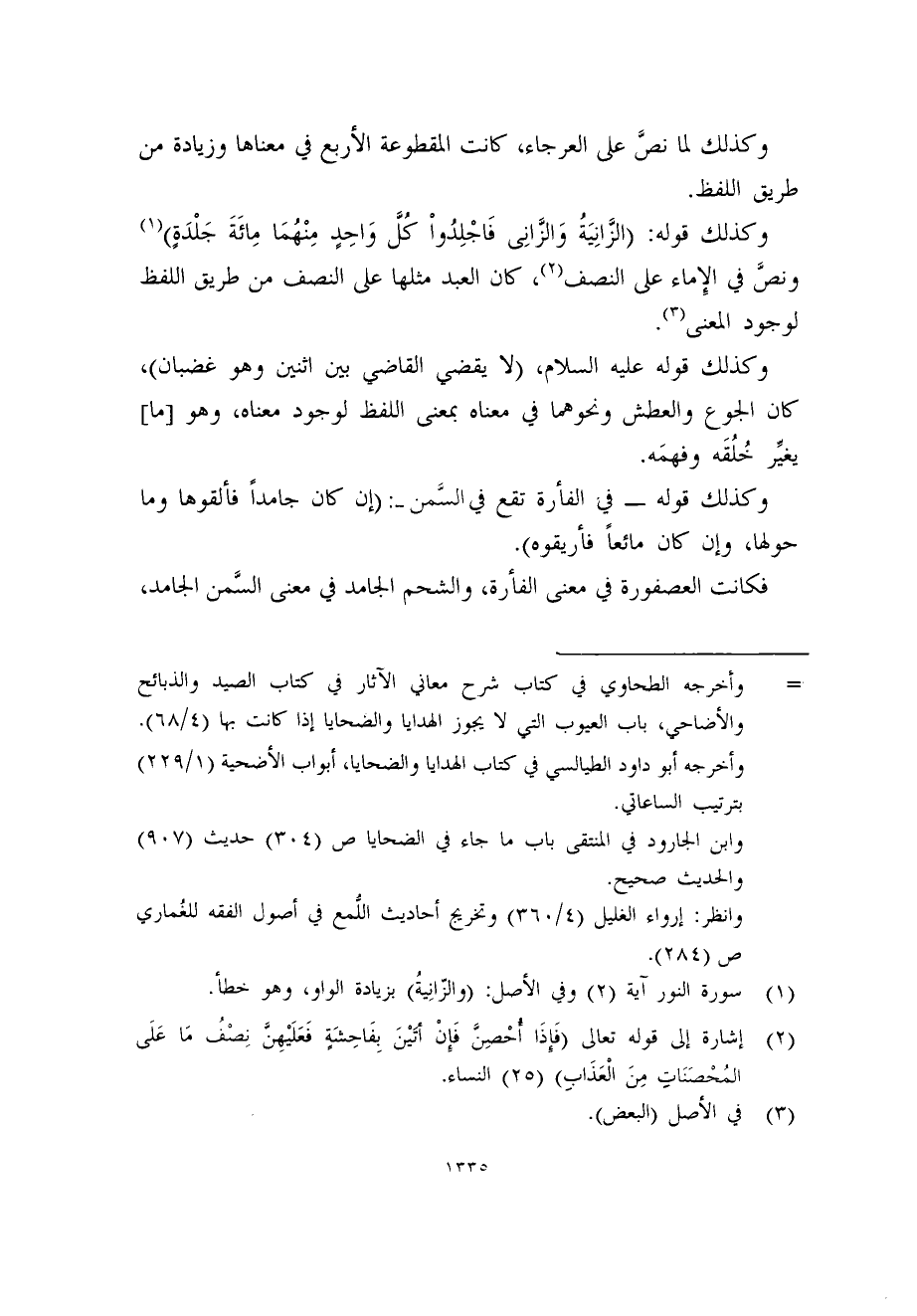 وكذلك قوله: (الزَّانِيَةُ وَالزَّانِى فَاجْلِدُواْ كُلَّ وَاحِدٍ مِنْهُمَا مِائَةَ جَلْدَةٍ) (1) ونص في الإِماء على النصف (2) ، كان العبد مثلها على النصف من طريق اللفظ لوجود المعنى (3) .