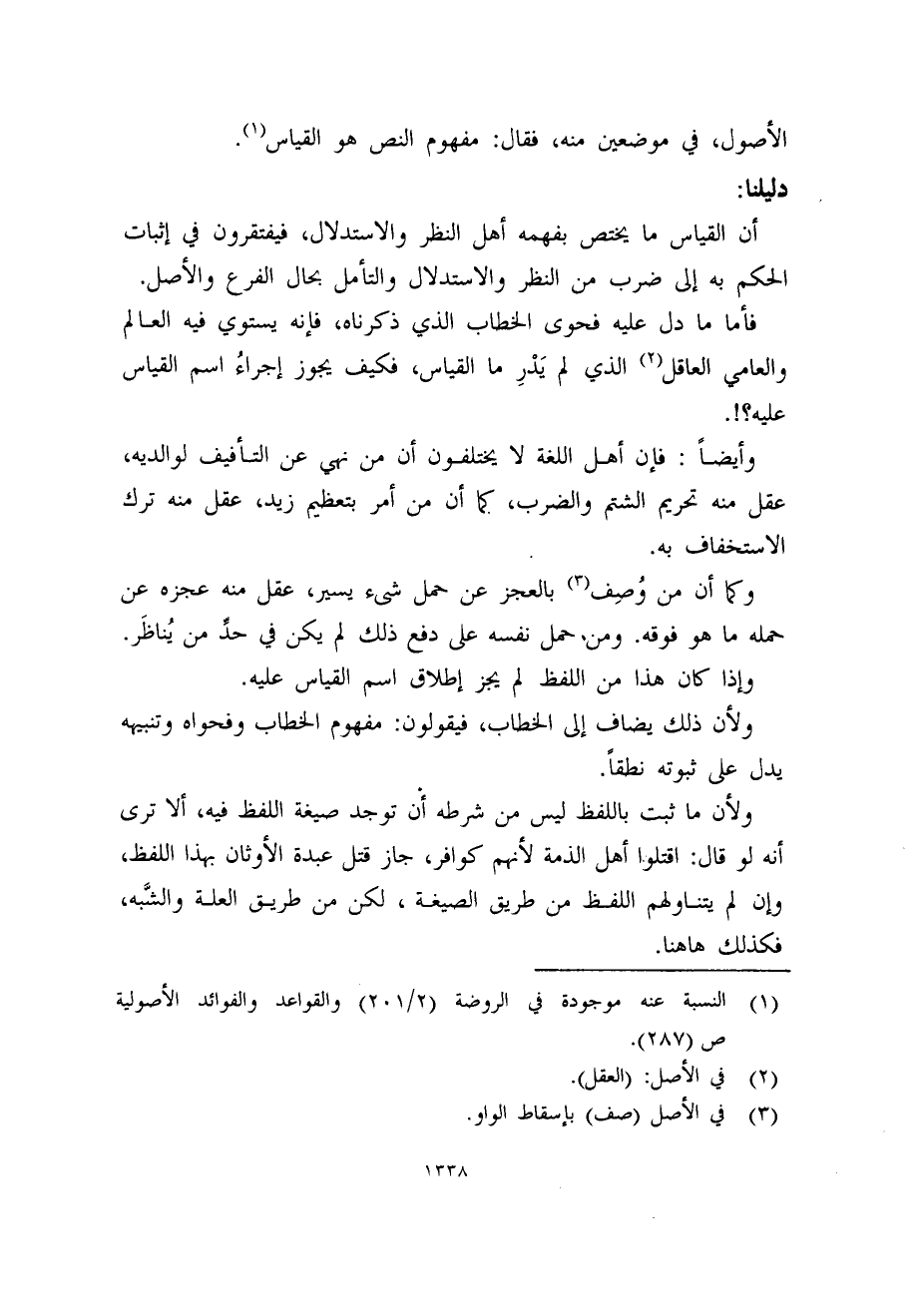 فأما ما دل عليه فحوى الخطاب الذي ذكرناه، فإنه يستوي فيه العالم والعامي العاقل (2) الذي لم يَدْرِ ما القياس، فكيف يجوز إجراءُ اسم القياس عليه؟!.