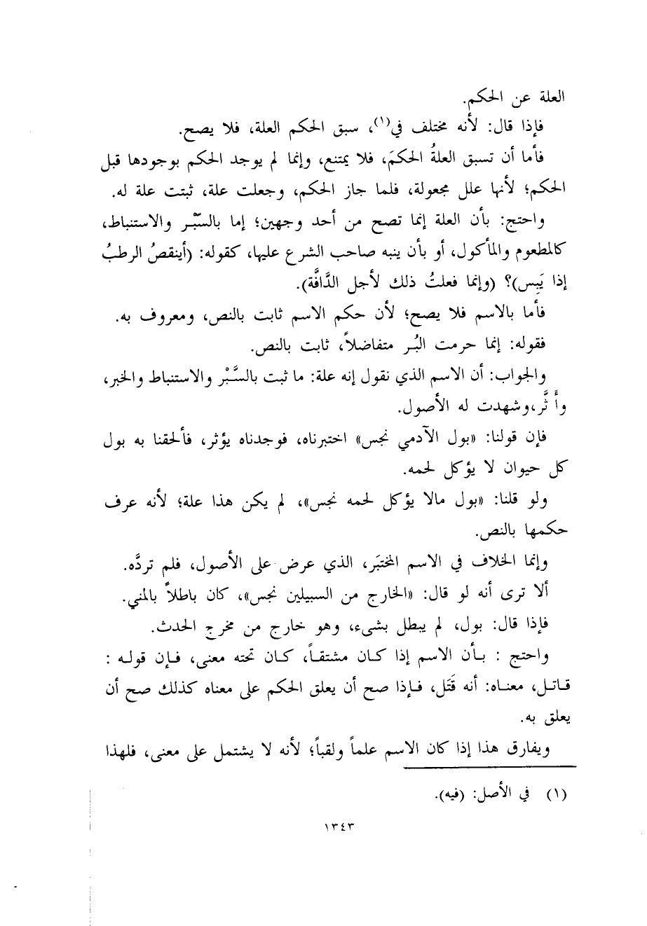 والجواب: أن الاسم الذي نقول إنه علة: ما ثبت بالسَّبْر والاستنباط والخبر، وأَثَّر، وشهدت له الأصول.